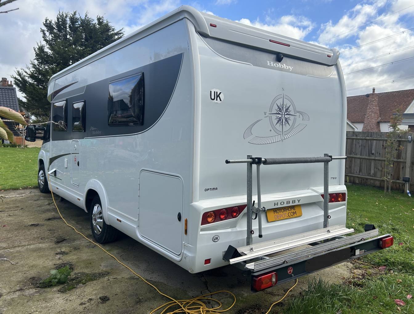 This Hobby is extremely comfortable to sleep in and has an excellent ISLAND BED at the rear. The front sofas also make up a further single bed should this be needed and comes with a split washroom that has a Thetford flush cassette toilet and sink on one side and a separate shower on the other. Heating and hot water are provided by the simple to use Truma Combi system. There is plenty of storage throughout this motorhome including lots of lockers, draws and even storage under the Island Bed. Outside there is a good sized garage that can be accessed from either side. This motorhome also comes with lots of extras which include a large wind out awning, solar panel, Gas Low system with 2 gas bottles as well as the scooter rack fitted at the rear.