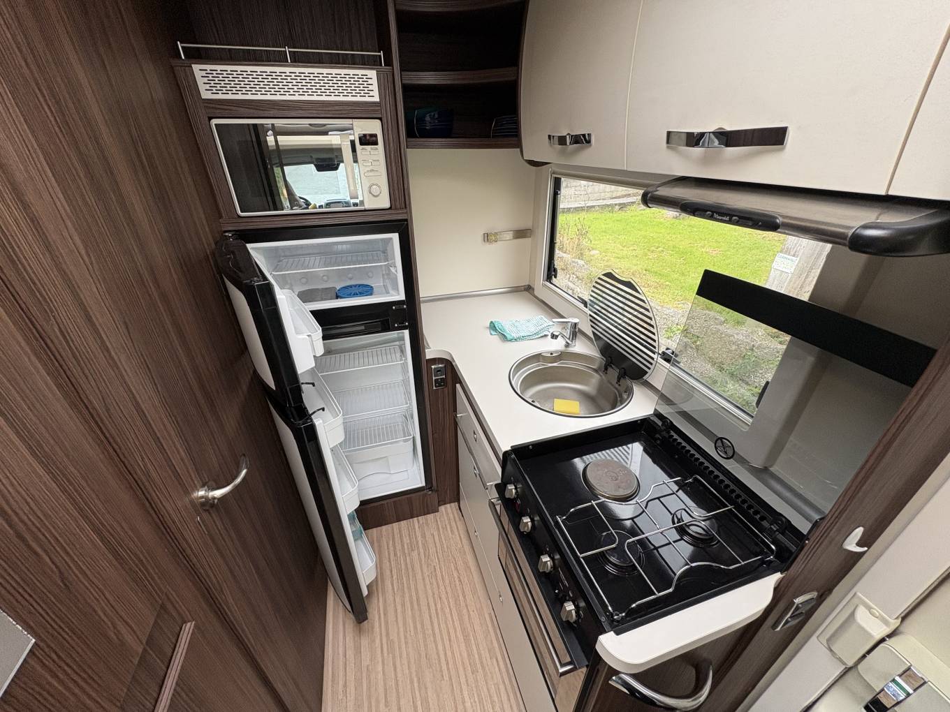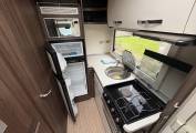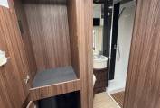 Layout – At the rear you have the spacious washroom that comes with the desired seperate shower cubicle and the kitchen area with storage cupboards, draws, prep area, 2 gas hobs, 1 electric plate, 240 extractor 2 way fan, oven and grill combi, large fridge and freezer space, hot and cold mixer tap. You have a wardrobe space just outside the washroom that also gives access the storage area that you can access from outside of the Benimar as well.