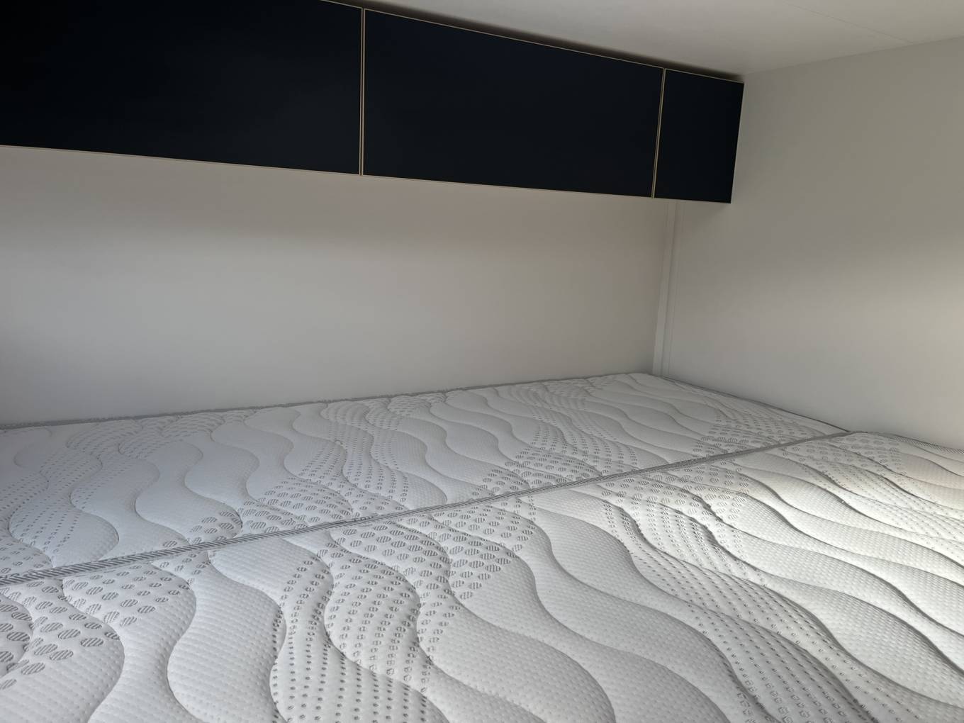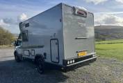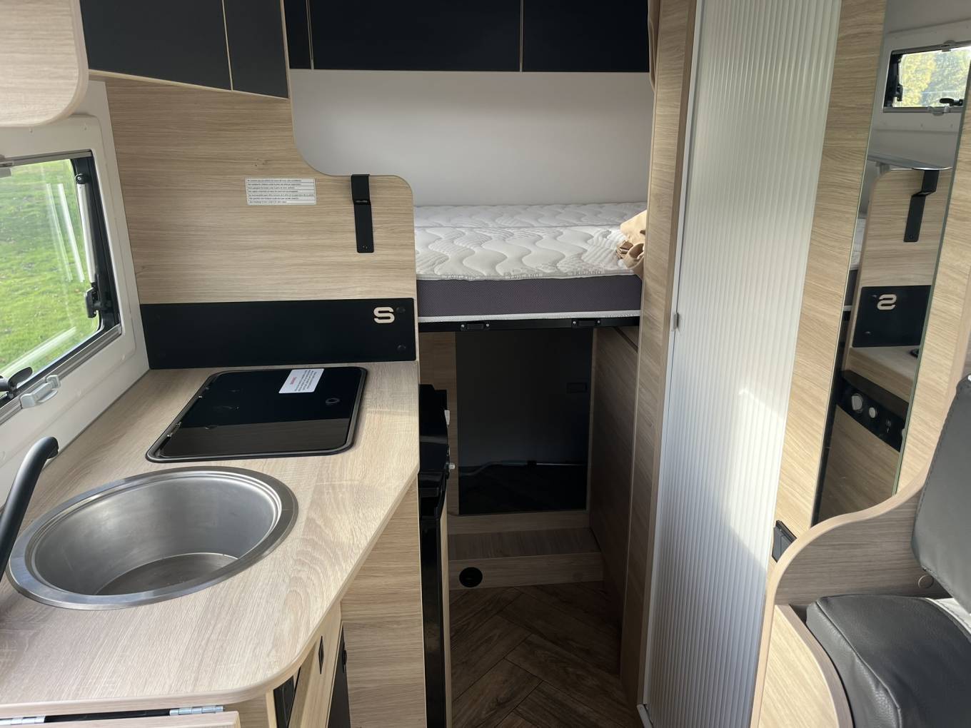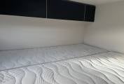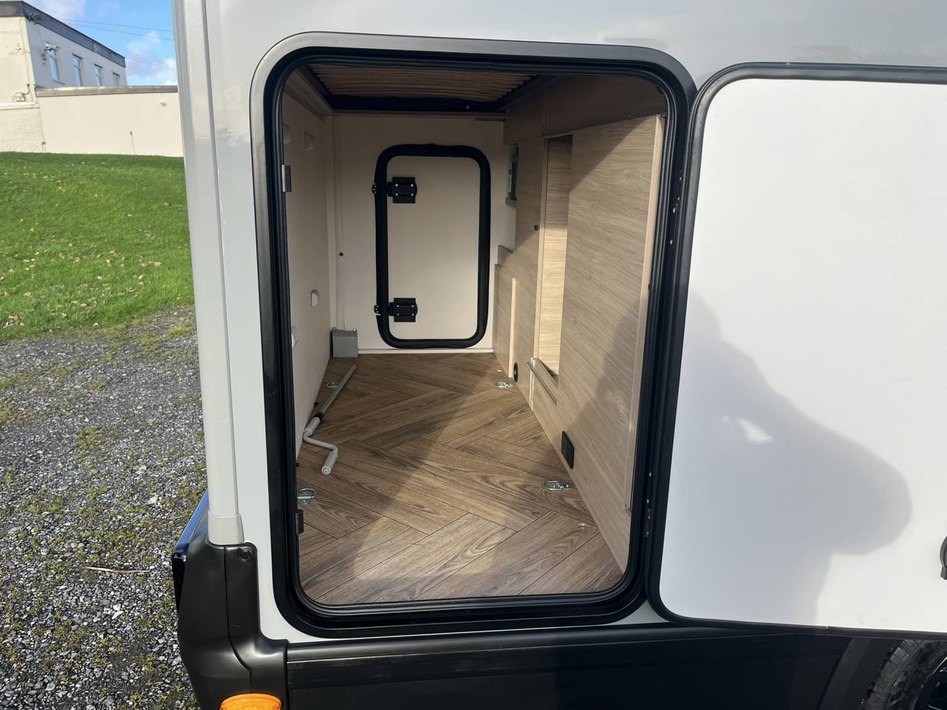 Rear transverse fixed bed over Garage. Plenty of storage. The bed can fold to access more space and a hatch through to the Garage (great for Dogs)