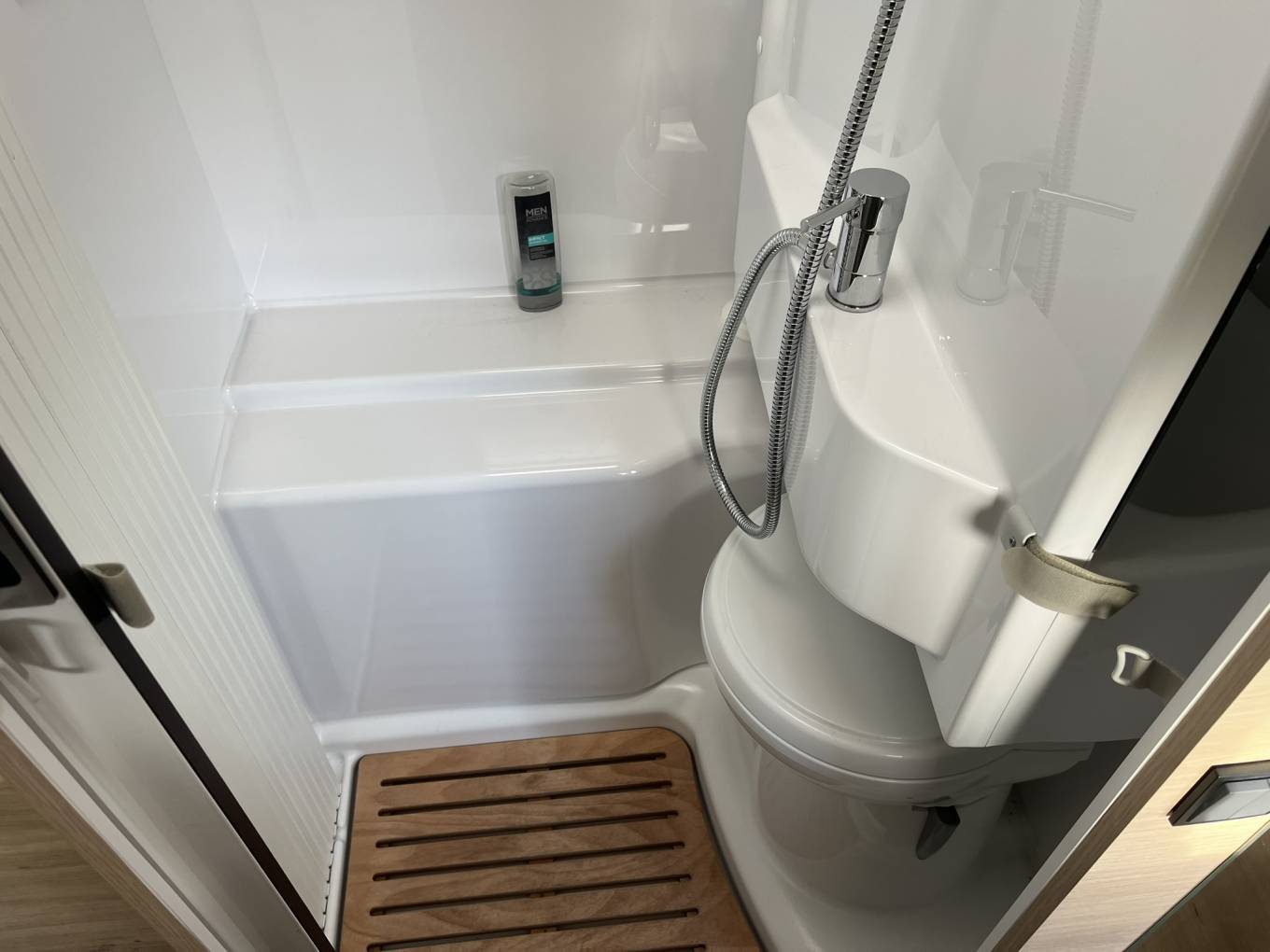 Washroom with toilet, basin and very clever moving separator wall to cover the toilet whilst using the shower. Storage cupboard and mirror.