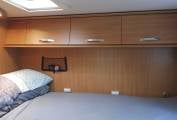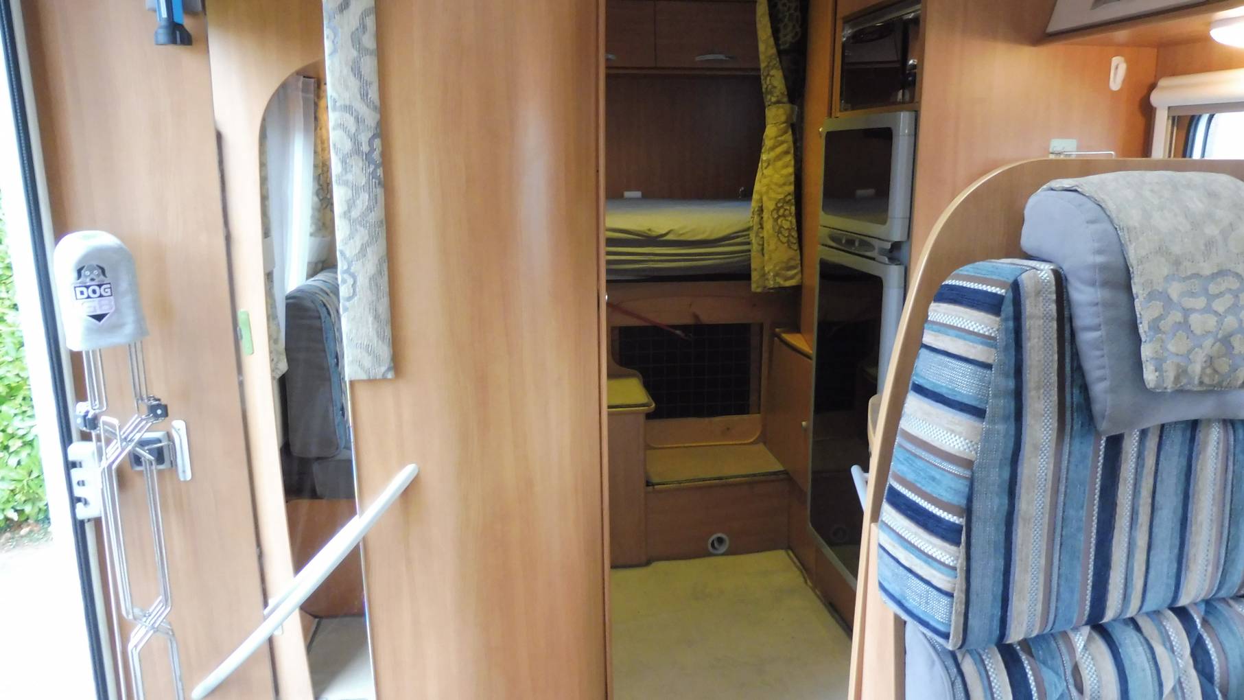 At the rear, the large transverse double bed is accessed using a small step-up. The bed is located over the huge rear garage that can be accessed from below the bed as well as externally.