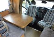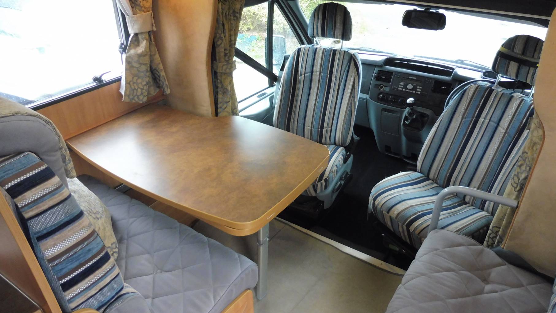 Step inside the habitation area and to the front you have the lounge / dining area where you find a two person forward facing bench seat complete with two 3-point seatbelts and a longitudinal bench seat with one lap-belt. Both the driver and passenger seats swivel into the area and with the large dining table, with extension piece, there is room for 6 to dine in comfort.