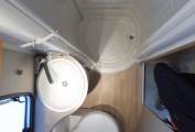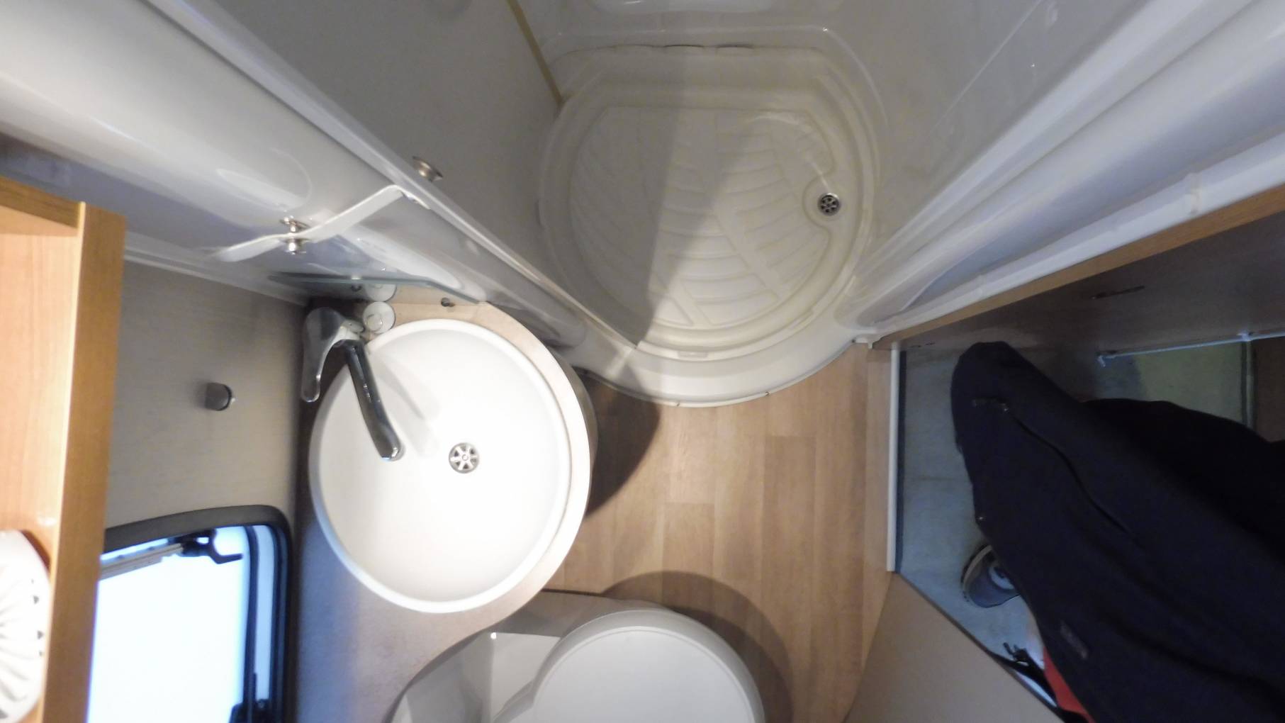 Opposite you will find the washroom with Thetford cassette toilet with electric flush, basin with mixer tap and separate shower area.
