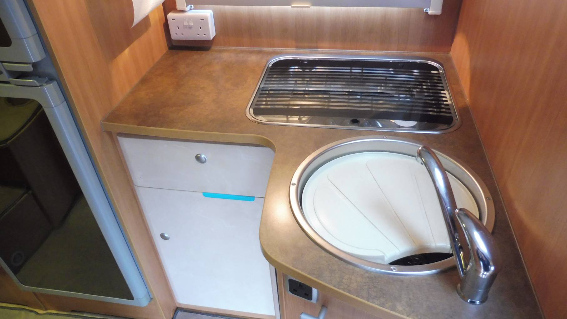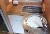 The kitchen is in the centre of the motorhome and has a 3-burner gas hob, grill, stainless-steel sink with mixer-tap, large 3-way fridge with a separate freezer compartment and plenty of storage options.