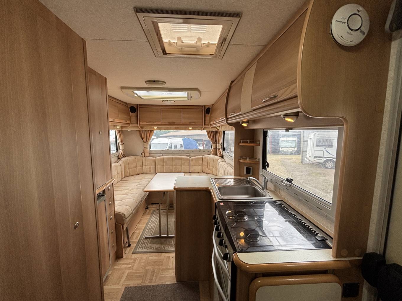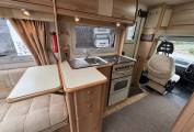 Moving forward, the kitchen is well-equipped with a gas oven and separate grill, four gas hobs, a sink with mixer tap and drainer, a 3-way fridge, and plenty of worktop and cupboard space.