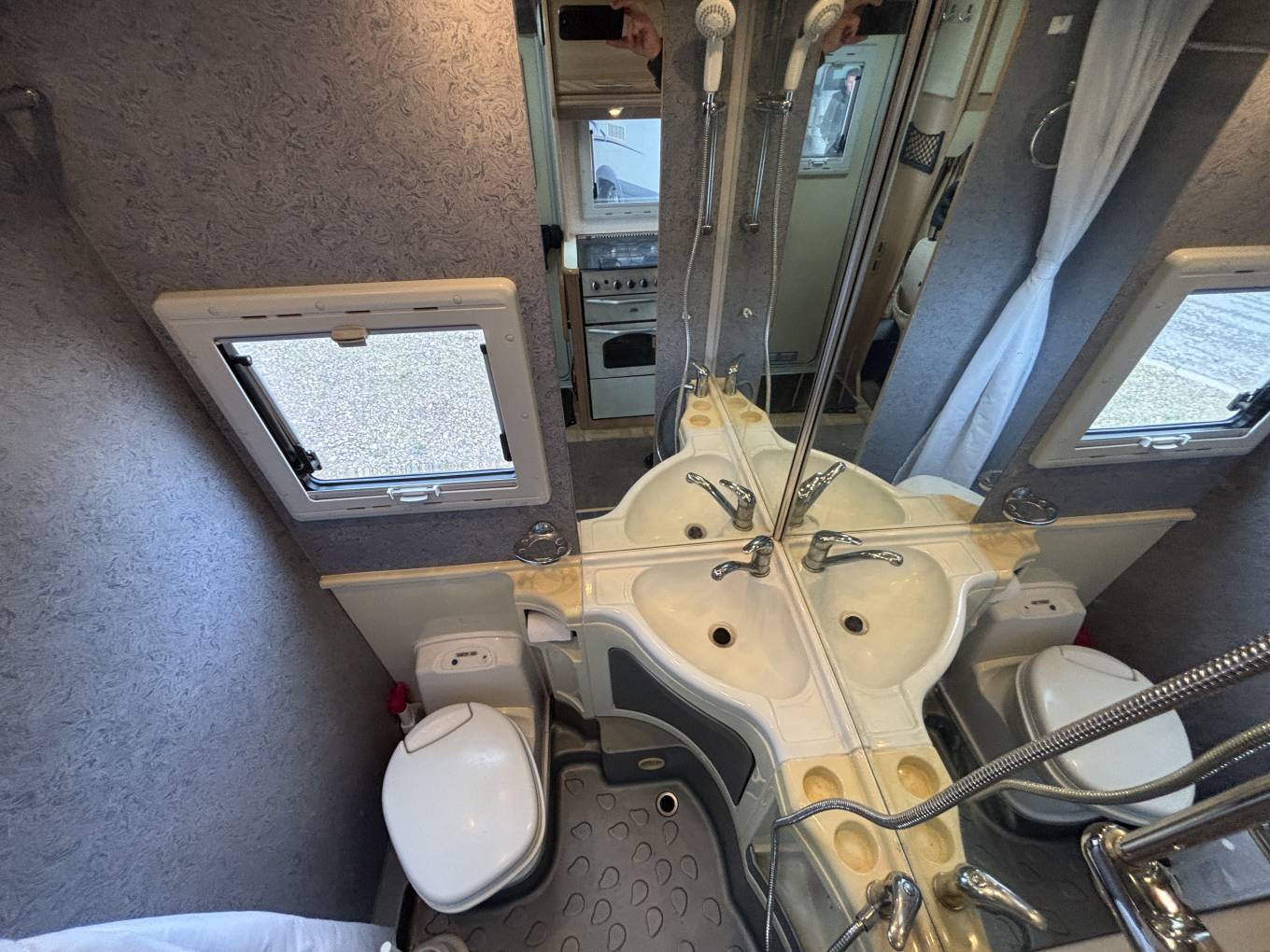 Opposite is a good size storage cupboard with hanging space and a washroom with Thetford electric flush toilet, wash basin with mixer tap, shower, vanity mirror & storage cupboard.