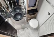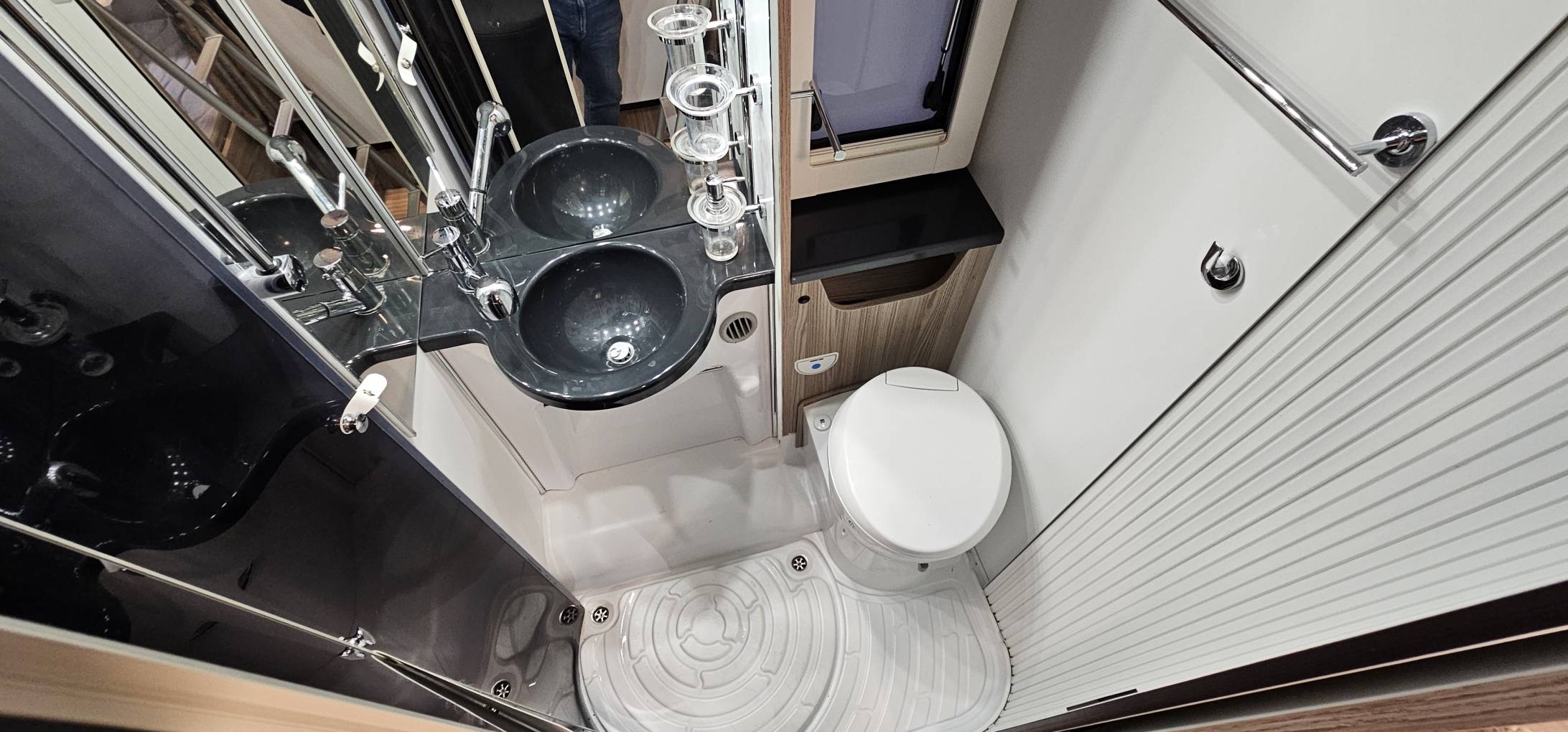 Opposite this is the bathroom with shower, cassette toilet and sink with vanity unit.