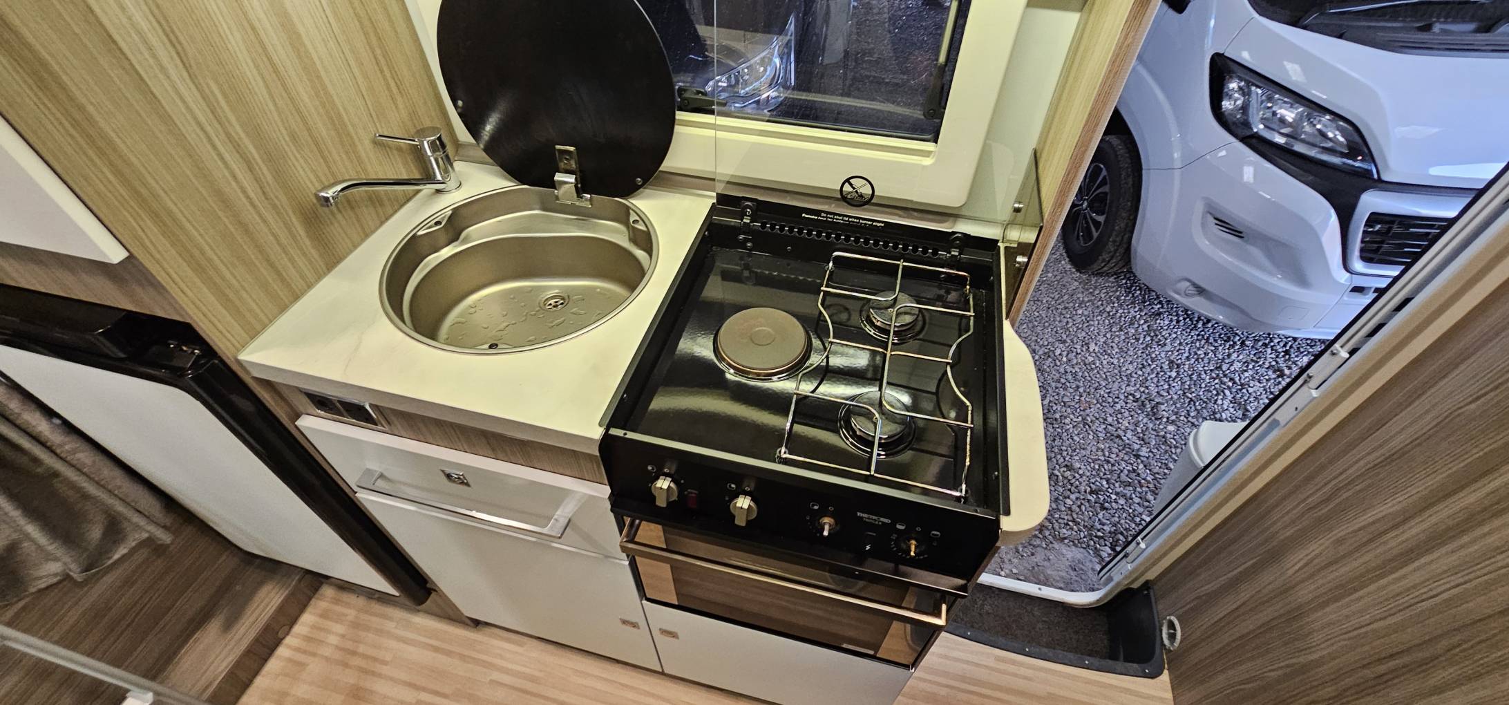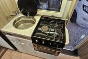 To the right of the door is the kitchen galley with sink, 2 x gas 1 x hot plate hob and small oven/grill.