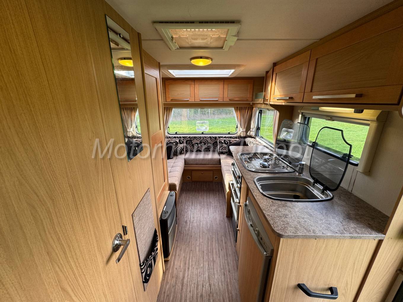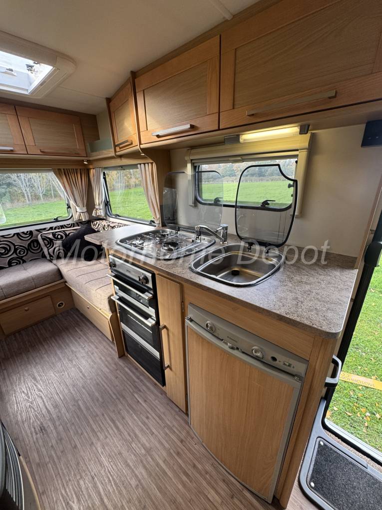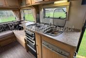 Moving forward, the central kitchen is well equipped with a full oven and grill, 3-burner gas hob, sink, and 3-way fridge with freezer compartment, while the washroom sits opposite, providing a cassette toilet, hand basin, and shower. Ample overhead lockers and under-seat storage help keep everything neatly stowed during your travels.
