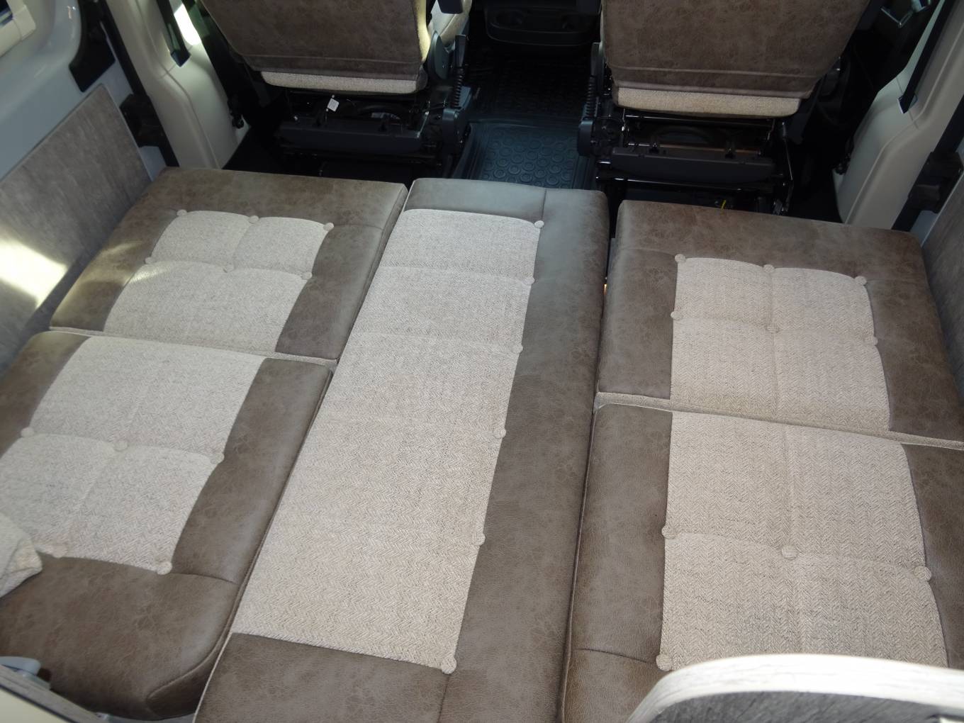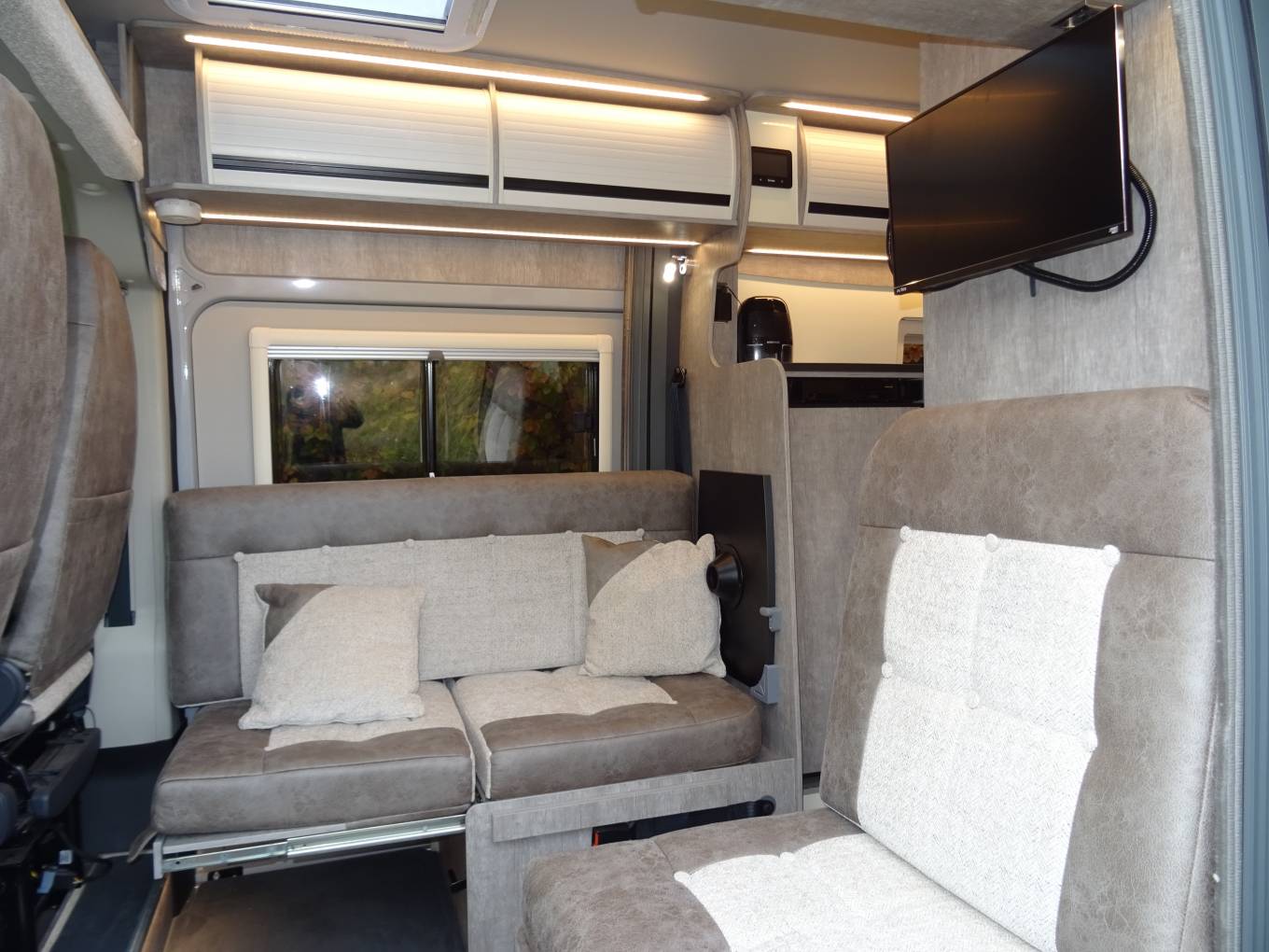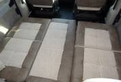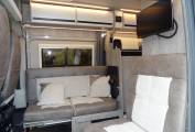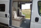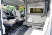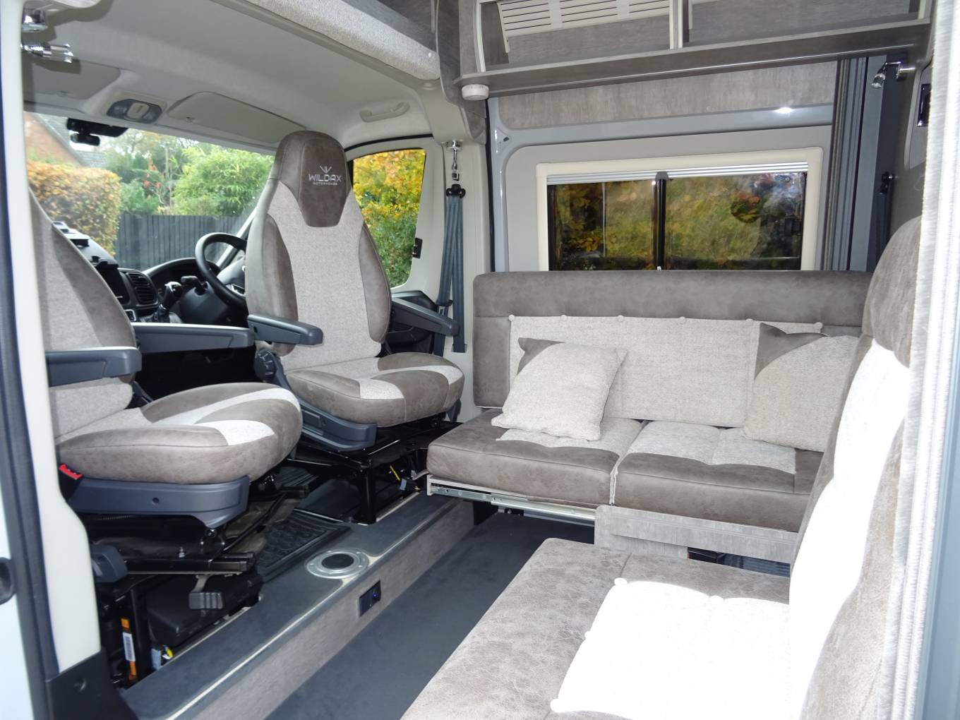 To the front, you will find the two additional travelling seats and two swivel captain seats, which provide a great dinette and easily slide to convert to either two single beds or one spacious double bed.