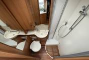 The spacious washroom has a separate fully enclosed shower, wash basin and a cassette toilet as well as ample mirrors and a vanity unit.