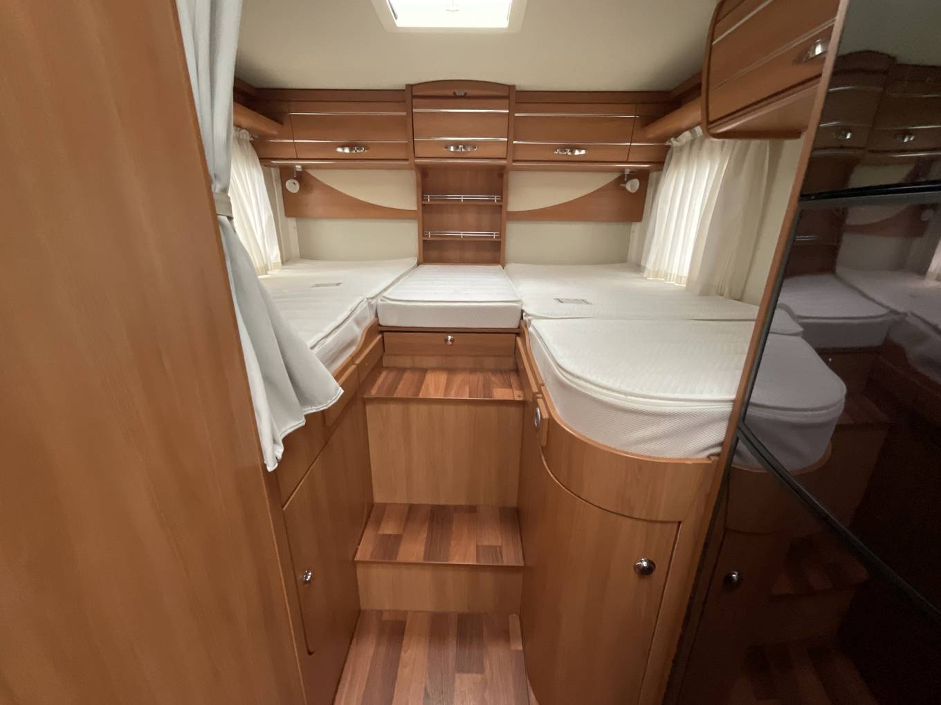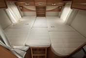 To the rear there are two large single beds for easy access and lots of under bed storage as well as more overhead lockers. There are two wardrobes to the foot of the beds. The bed can quickly be converted into a very large double if required.