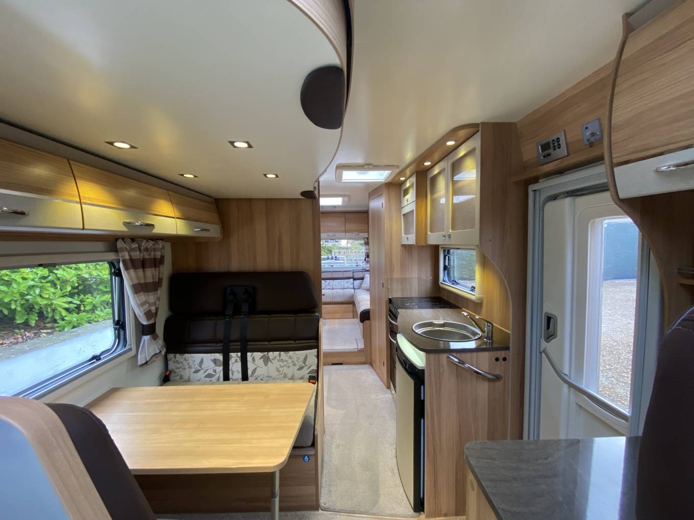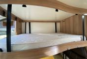 Front dinette with 4 belted seats and removable table converts to double bed, plus electric drop-down double bed above.