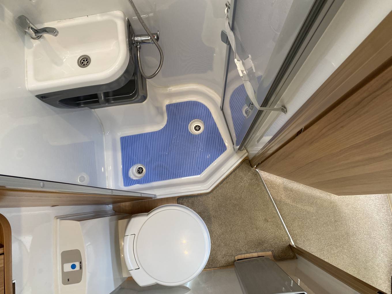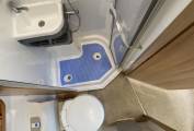 Central washroom with Thetford toilet, wash basin, shower and ALDE radiator.