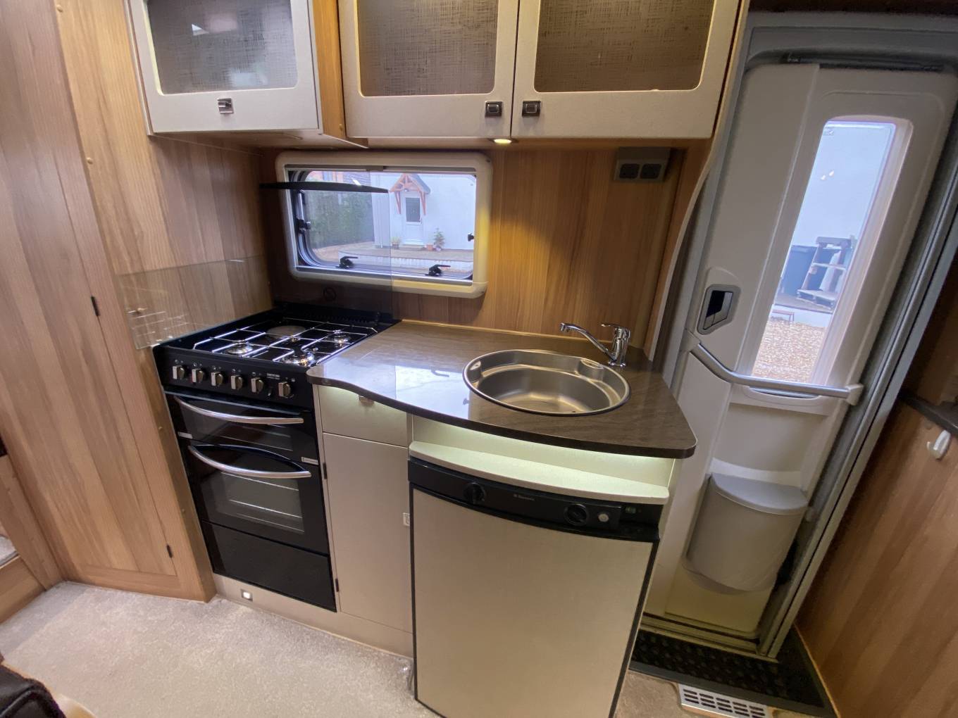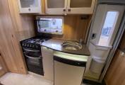 Mid kitchen with oven, grill, 3-gas + 1-electric hob, microwave, sink and 3-way fridge/freezer.