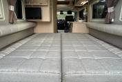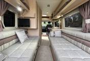 Inside, the Warwick Duo features a spacious rear lounge that easily converts into either two single beds or a large double bed. The comfortable, high-quality upholstery and neutral tones create a relaxing, modern environment. The lounge area also includes a freestanding dining table, ideal for meals or leisure time, with large windows and fitted curtains for light and privacy.