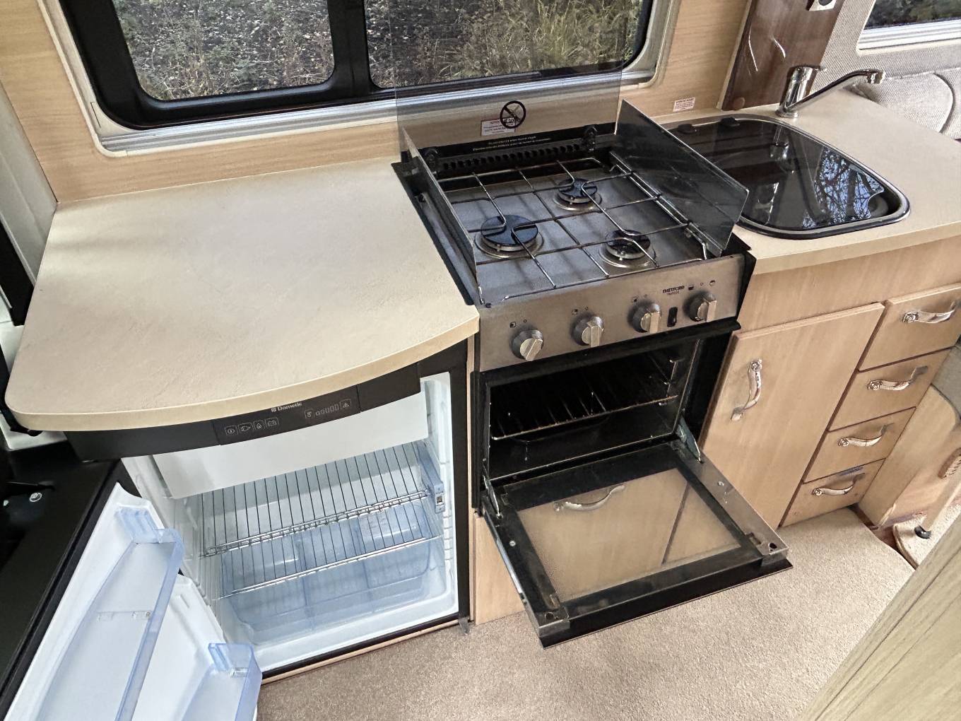 The kitchen is thoughtfully designed and fully equipped with an oven and grill, microwave, gas hob, 3 way fridge with freezer section and plenty of storage space for your kitchen essentials.There is even a worktop area on top of the fridge which is ideal for food preparation.