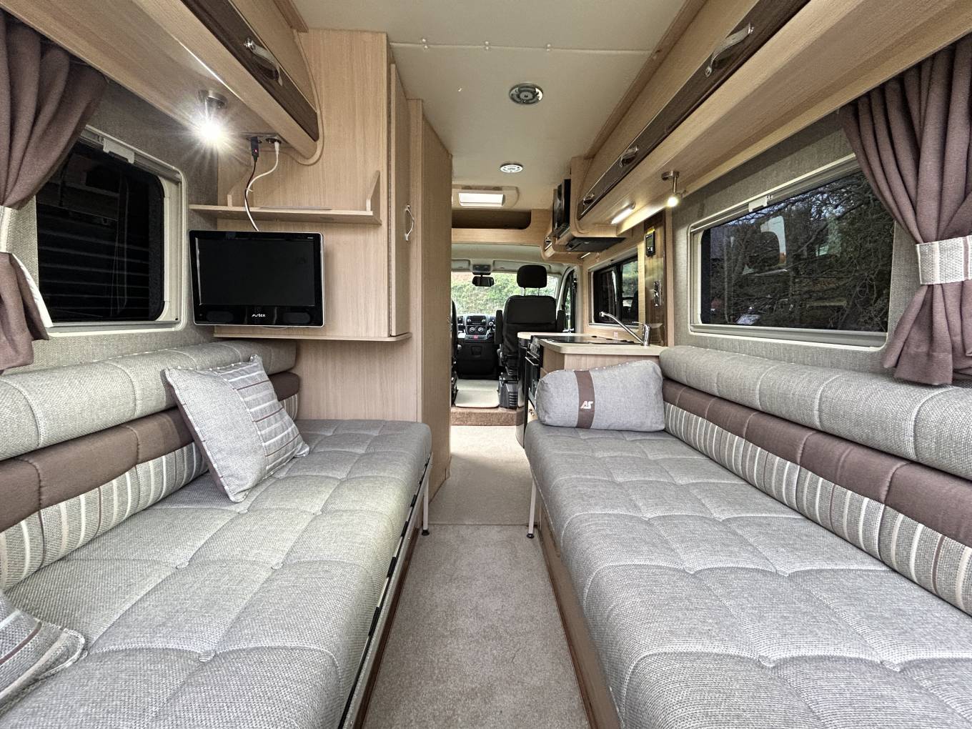 The vehicle interior feels open and airy, with excellent lighting and a cleverly designed layout that maximises living space. A TV/DVD system provides in-van entertainment, and the front passenger seat swivels to enhance the living area.