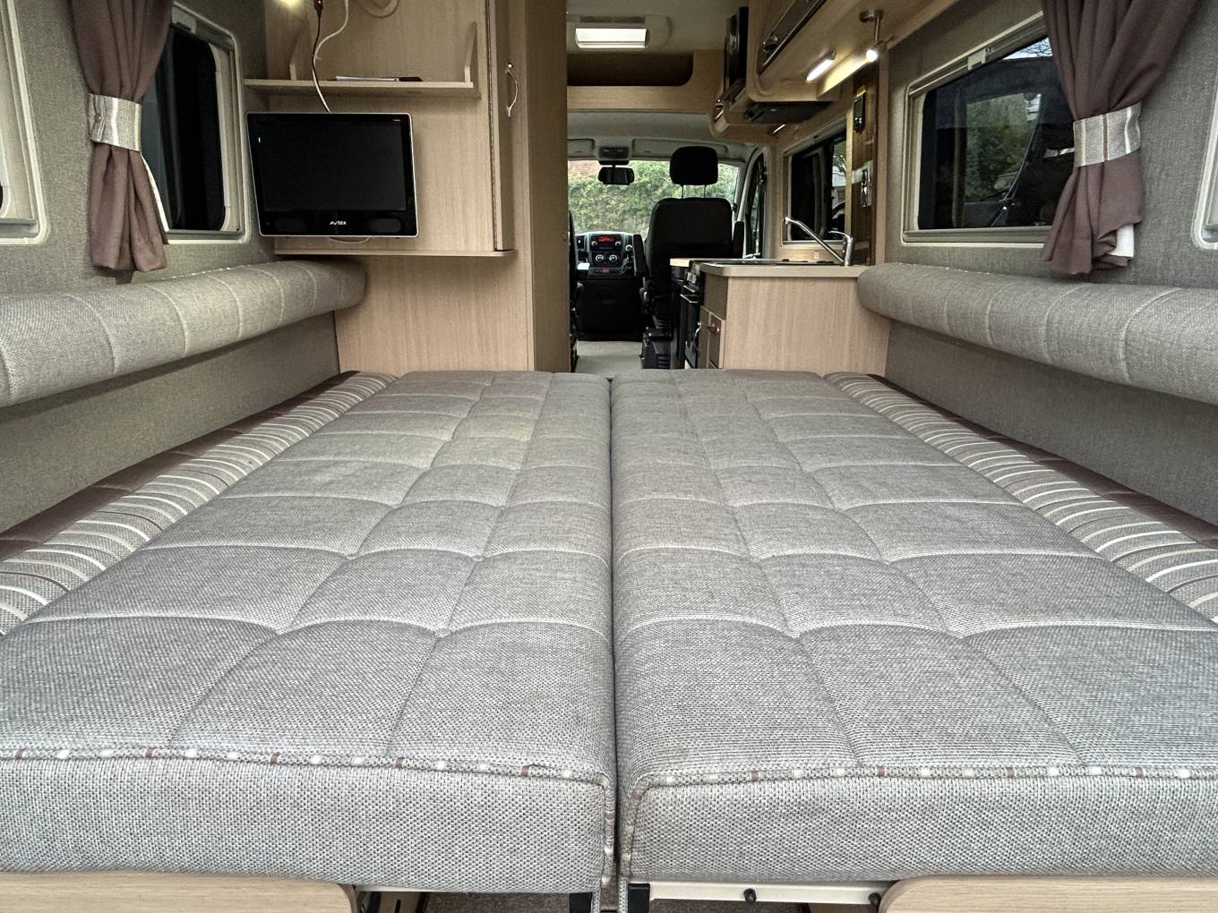 Externally, this Warwick Duo is equally impressive. It comes fitted with a wind-out awning, perfect for creating shaded outdoor space. Other premium features include air suspension for a much smoother ride, a solar panel to keep your leisure battery topped up for off-grid capability, a tow bar, reversing camera, reversing sensors, and an underslung gas tank for convenience and efficiency. The cab offers air conditioning and cruise control to make long drives more comfortable.