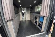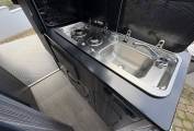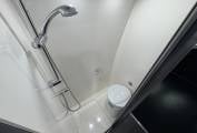 Layout – At the rear you have the electric large drop down bed that when down in the sleeping position still gives you enough space to have a cup of coffee or a glass of wine in the evening whilst still giving you a large garage space and when the bed is up you have a huge area to work with, in the rear you also have storage lockers, TV, speakers and both leisure batteries. Then comes the spotless washroom with a shower, toiler and fan. Across from here is the kitchen area which gives you everything you need with 2 gas hobs, thretford fridge with freezer space, microwave, oven and grill combi, hot and cold mixer tap and you also have a pop up prep unit and more cupboards for all your pots and pans. You then have the seating area at the front and here is the second TV.