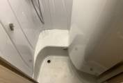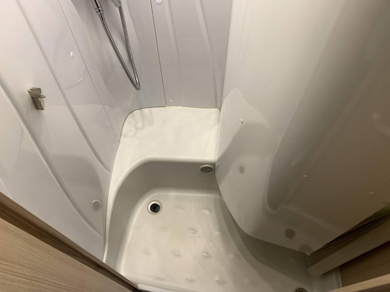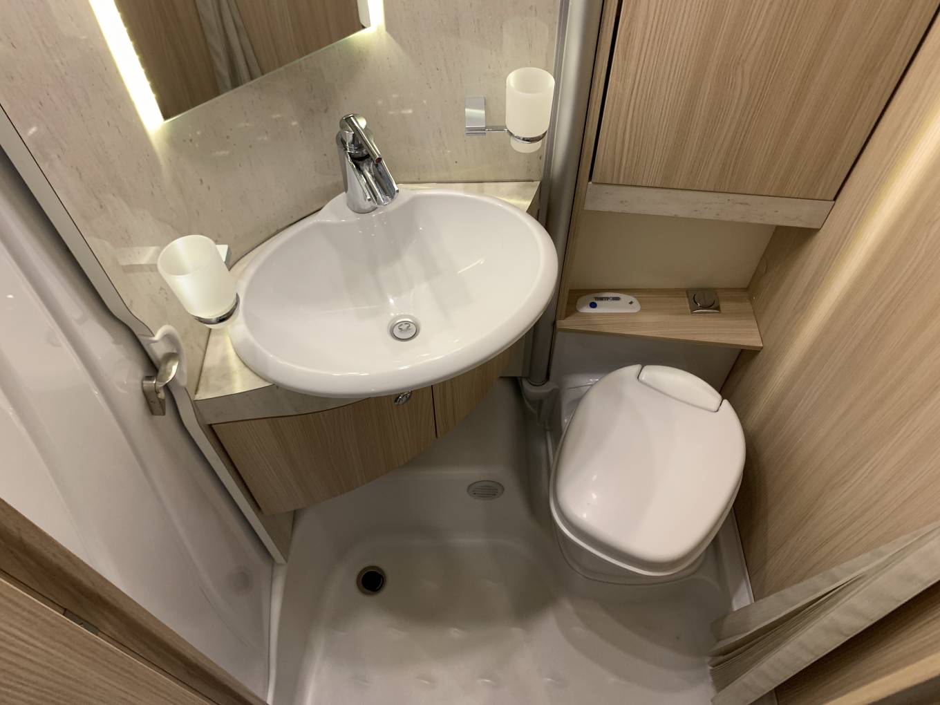 The kitchen is on the drivers side with the washroom behind, the curved wall opens to provide a generous sized shower.