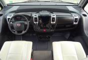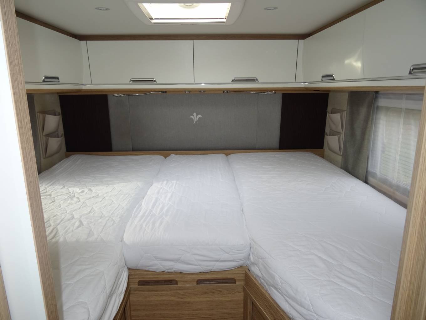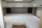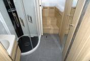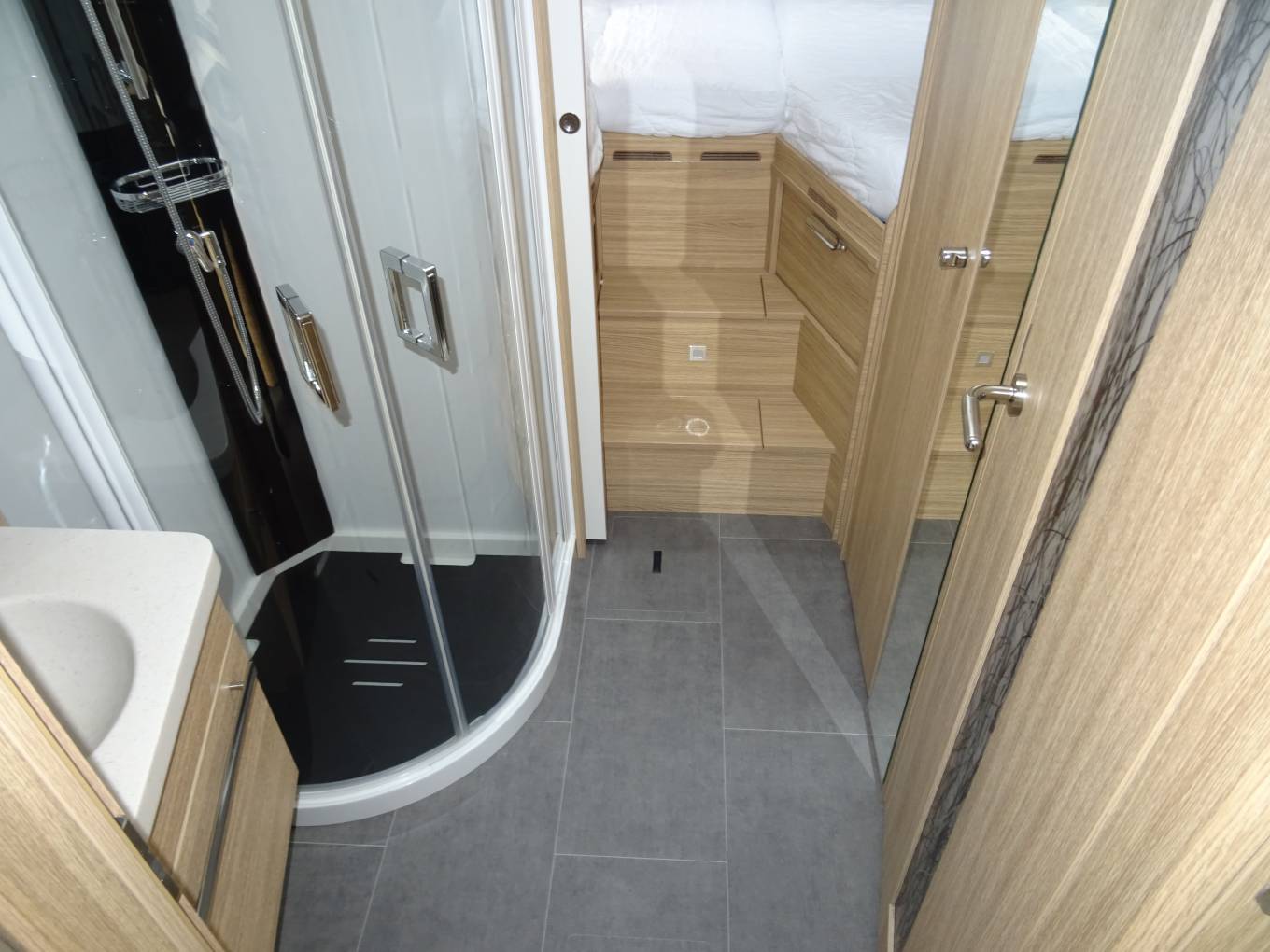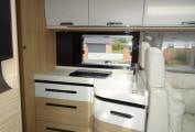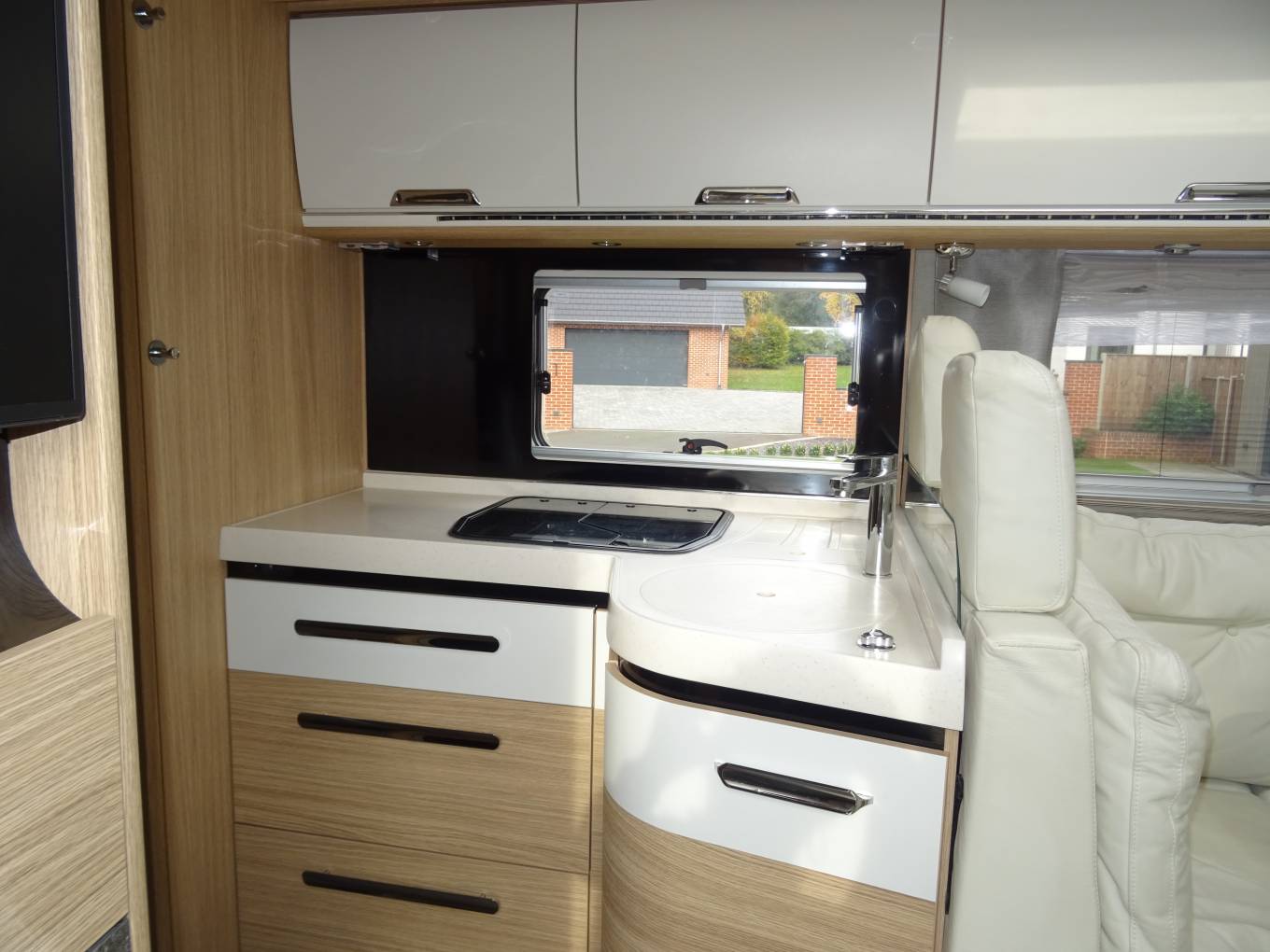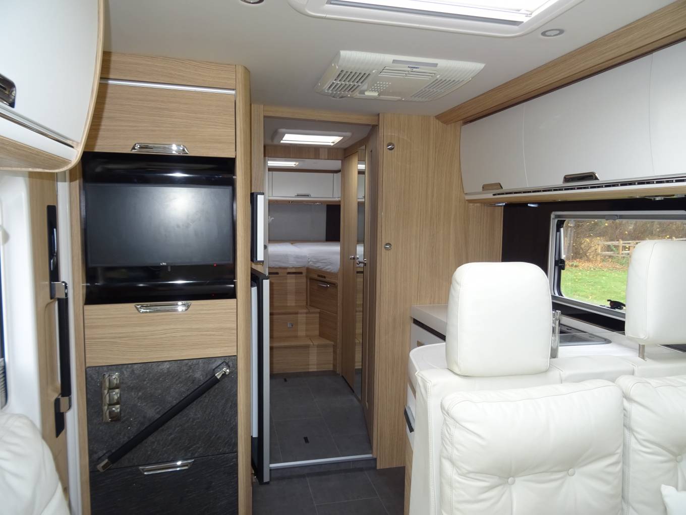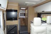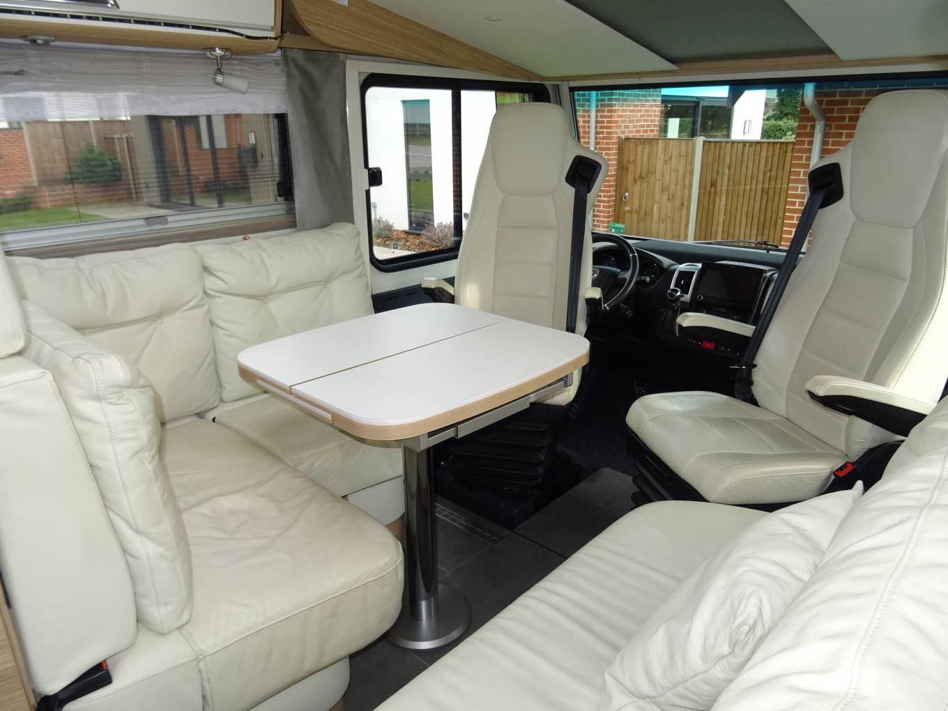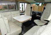 As you enter the through the side door you have the central kitchen which includes a gas hob with glass lid, good work top space high level mini oven and a large capacity fridge with separate freezer compartment. At the front is a lounge dinette in white with table. Both front captain seats swivel round making this a very nice area to relax or dine in. This area also incorporating two forward facing rear passenger belted seats and a bench seat opposite and wall mounted TV.