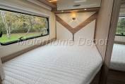 To the rear, the fixed French bed offers a comfortable sleeping space with storage beneath, and the adjacent bathroom cleverly integrates a rotating wall system to separate the shower area, keeping the rest of the room dry and functional — an excellent example of Bürstner’s thoughtful engineering in a compact design.