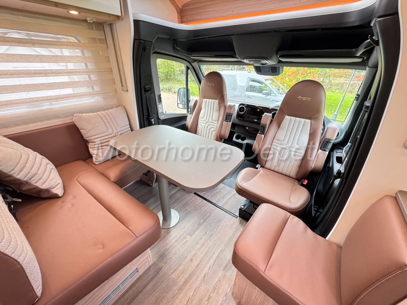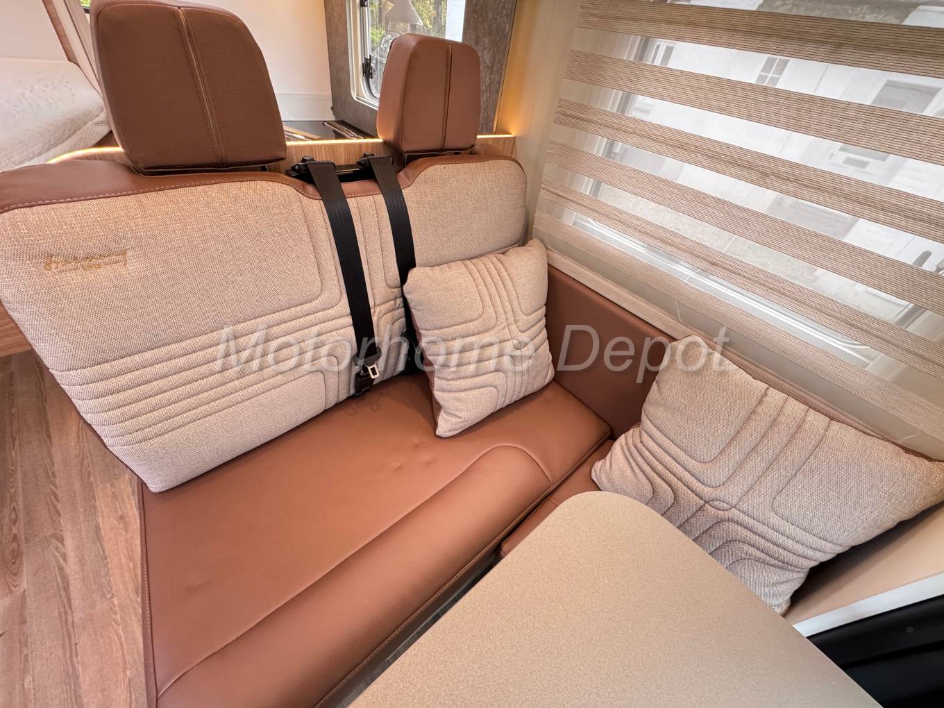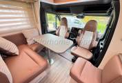 At the front, a well-proportioned dinette provides space for relaxing or dining, with two forward-facing travelling seats and a large electric drop-down double bed overhead — perfect for couples or occasional guests.
