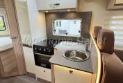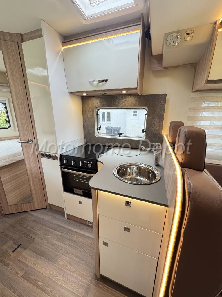 Midway through, the fully equipped kitchen includes a gas hob, stainless-steel sink, ample storage, and fridge/freezer, all set within Bürstner’s modern interior finish.