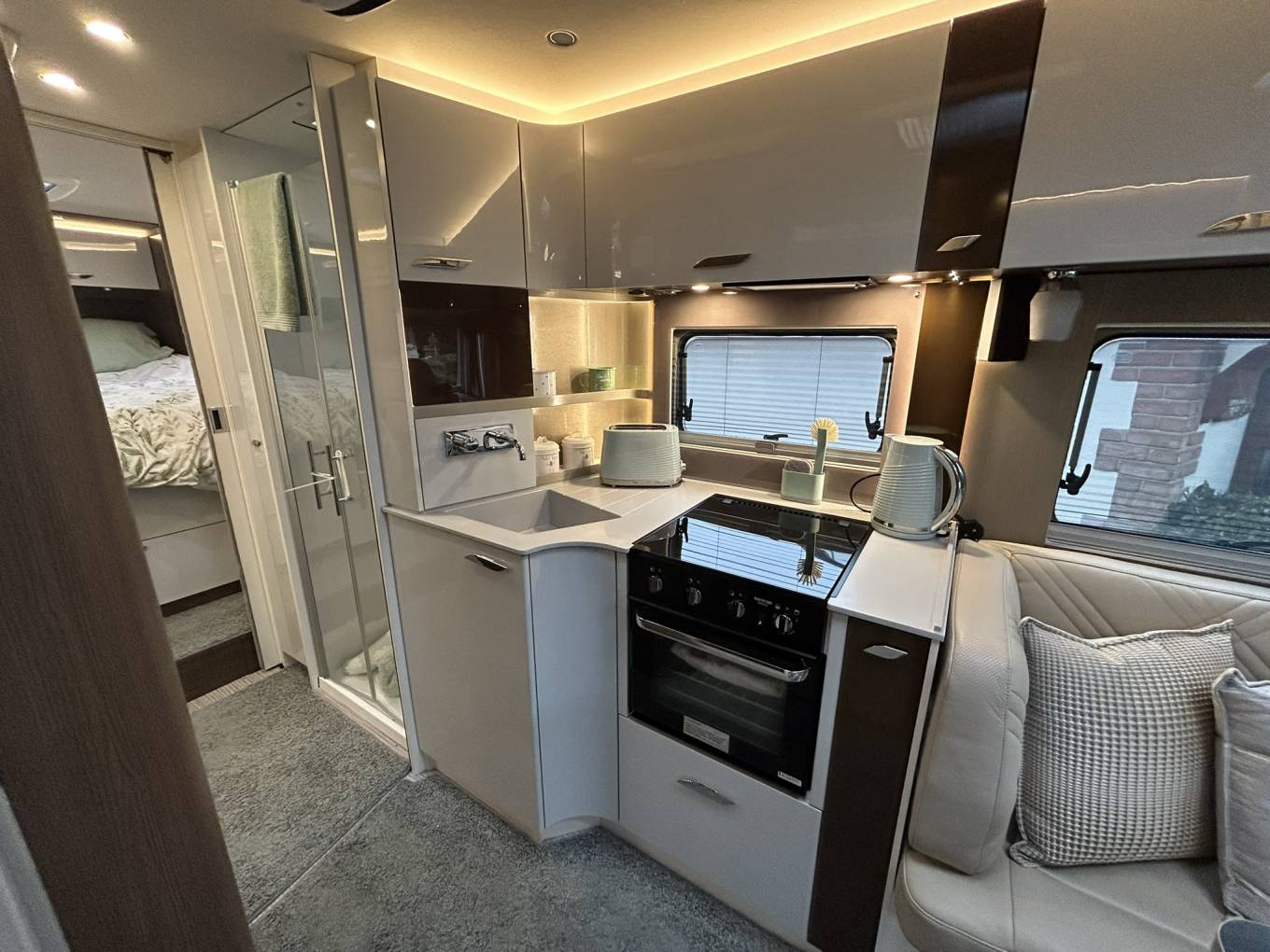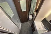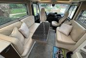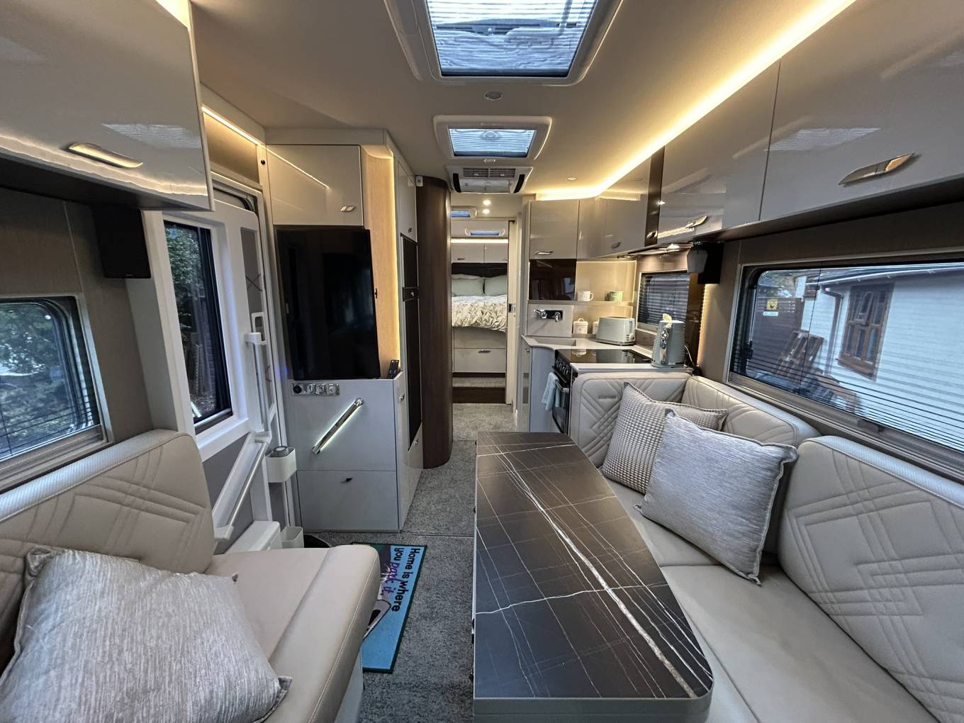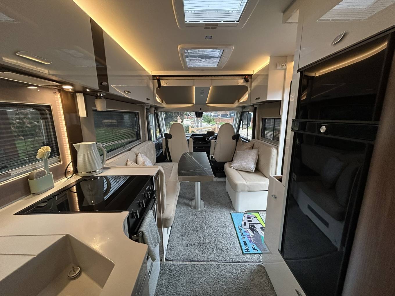 Built for year-round touring, this Elegance model comes equipped with the sought-after Winter Pack (heating under cab seats + heated cab seats), Alde heating system, and habitation air conditioning, ensuring comfort in all climates. The interior layout is both spacious and refined, featuring a rear island bed, an electric drop-down double bed, and a generous lounge with swivel cab seats and full cab privacy blinds.