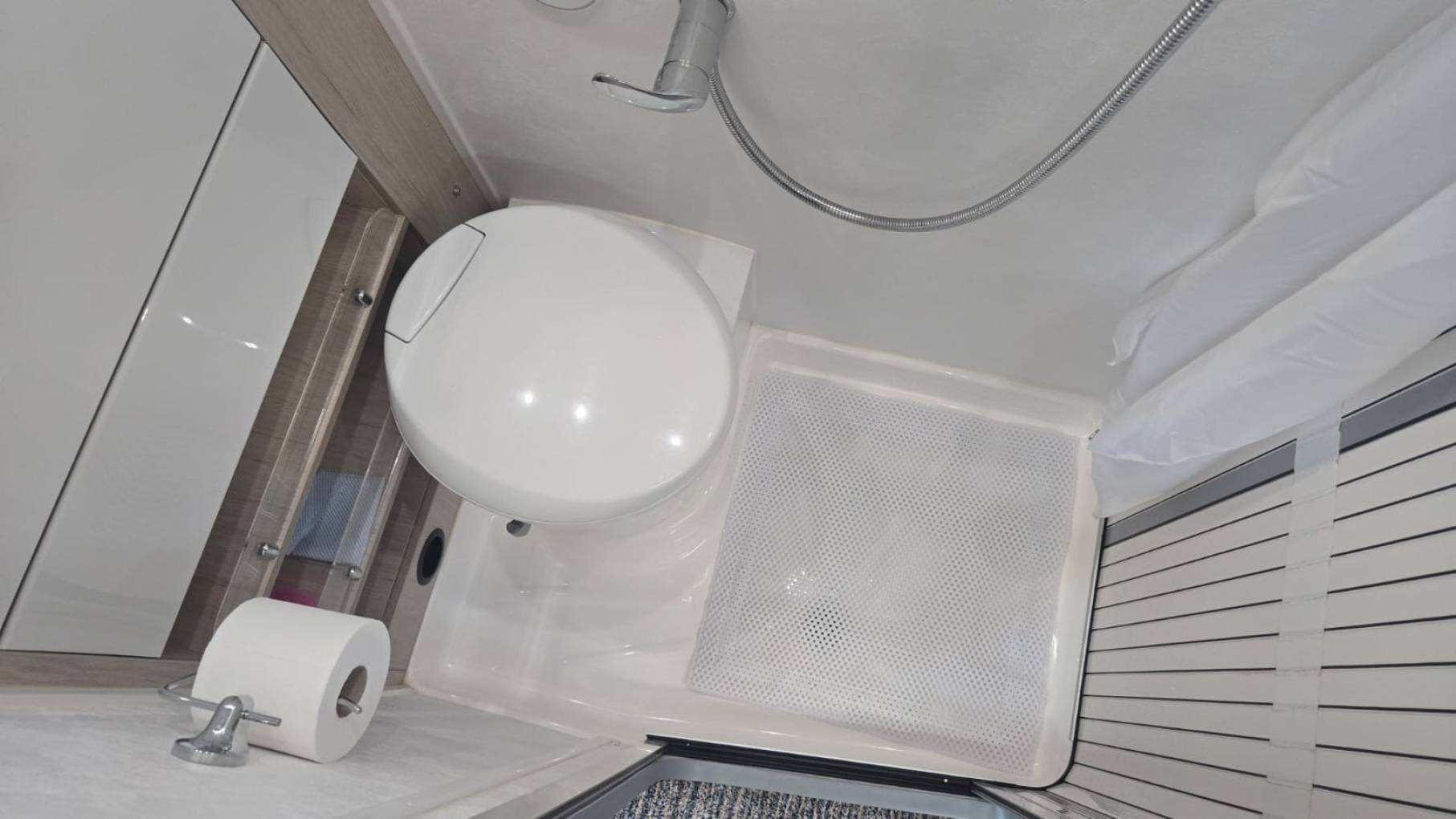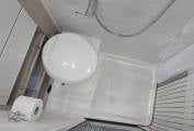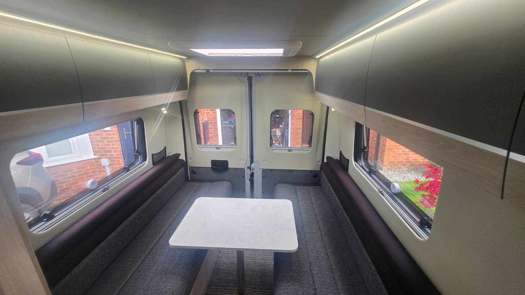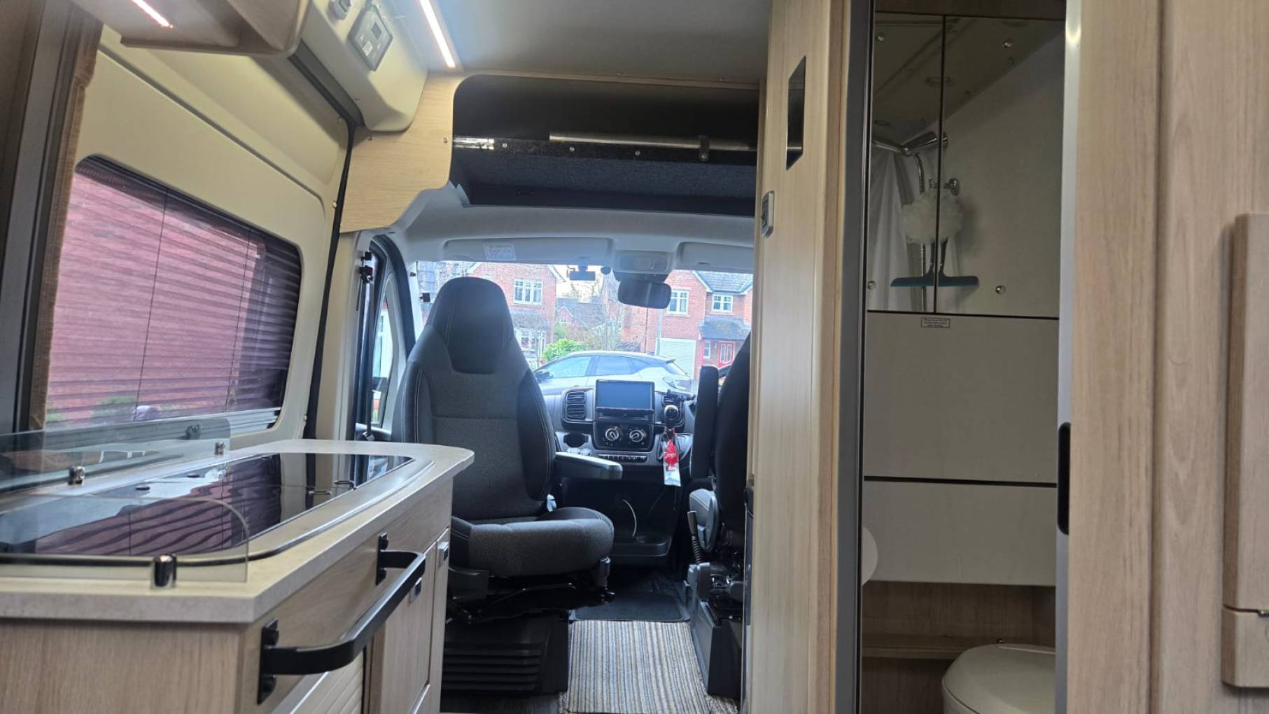 The spacious layout is from the rear you have an extra-long lounge seating area with dining table which easily converts into either two singles or a super king-sized bed for a comfortable night’s sleep. Rotating captain swivel seats at the front provide an extra seating area to relax. In the center there is a full washroom with toilet, shower and drop down sink. Opposite the side kitchen includes a two ring hob, oven, grill and sink. This camper has an oven which is not fitted and still in its box and packaging as the owners decided they wanted the storage area instead of an oven installed. There is a 3-way automatic powered fridge freezer (240v/12v/Gas) and with this spacious layout there is ample storage in the overhead lockers and under seating area. Heating and hot water is powered by the Whale heating system by either gas or electric.