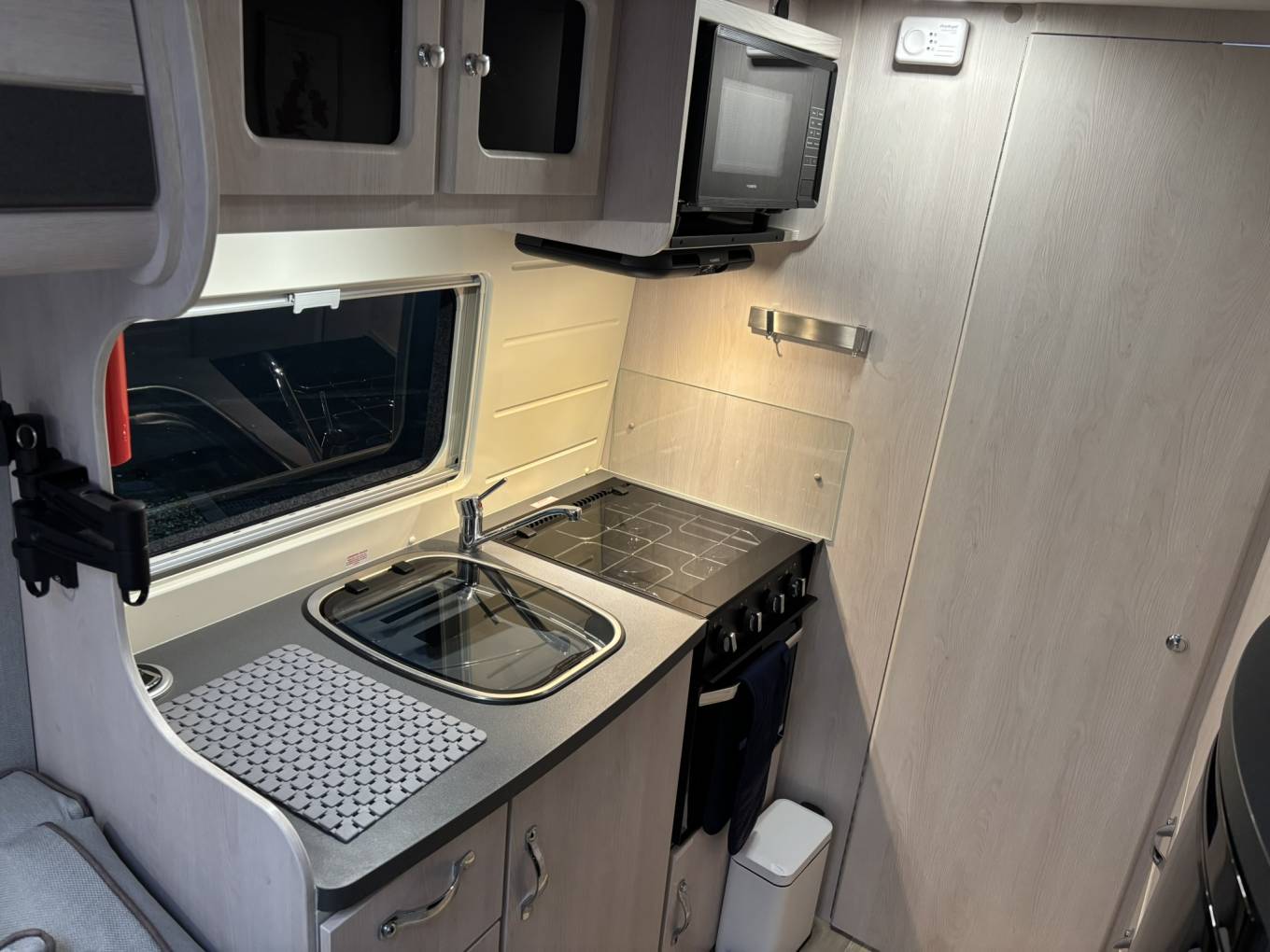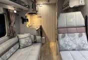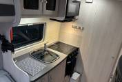 The well-designed layout features a spacious rear washroom that’s the hallmark of the Kemerton XL, offering a separate shower cubicle, electric flush toilet, vanity unit, and generous storage. The central kitchen includes a 3-burner gas hob, oven/grill, microwave, large fridge/freezer, and sink with mixer tap.