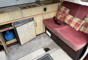 The galley kitchen has a sink, 2 gas burner hob with grill, plus 3 way fridge. The covers for the sink and cooker have drop down worktops