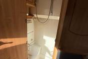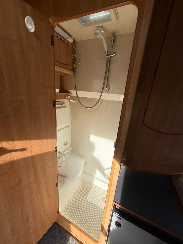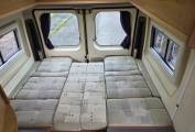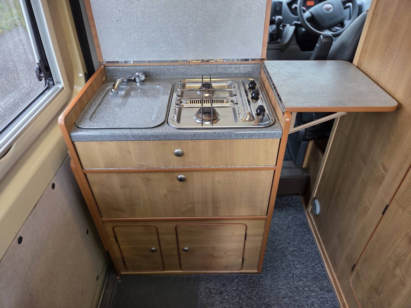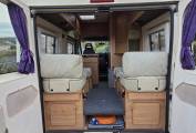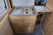 As you enter the Camper through the very practical large sliding door, we have the kitchen area with a 2 ring gas hob, grill, sink with mixer tap and a fridge with separate freezer compartment. Opposite is the washroom with a toilet, drop down sink with mixer tap and shower.