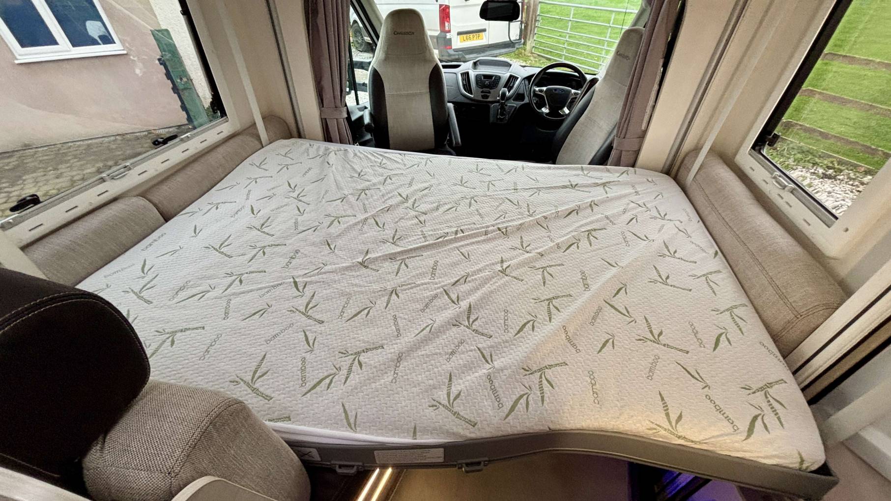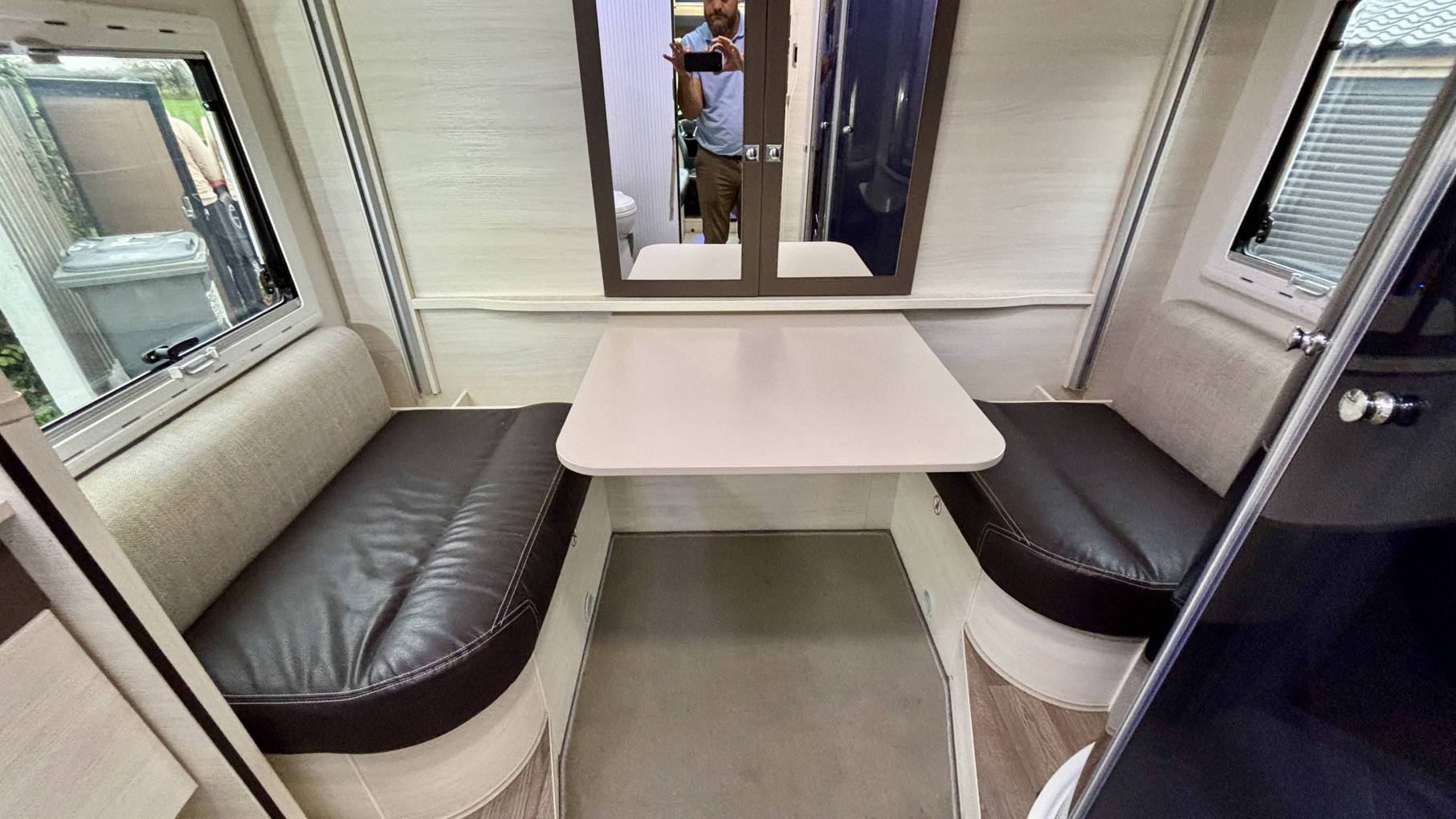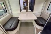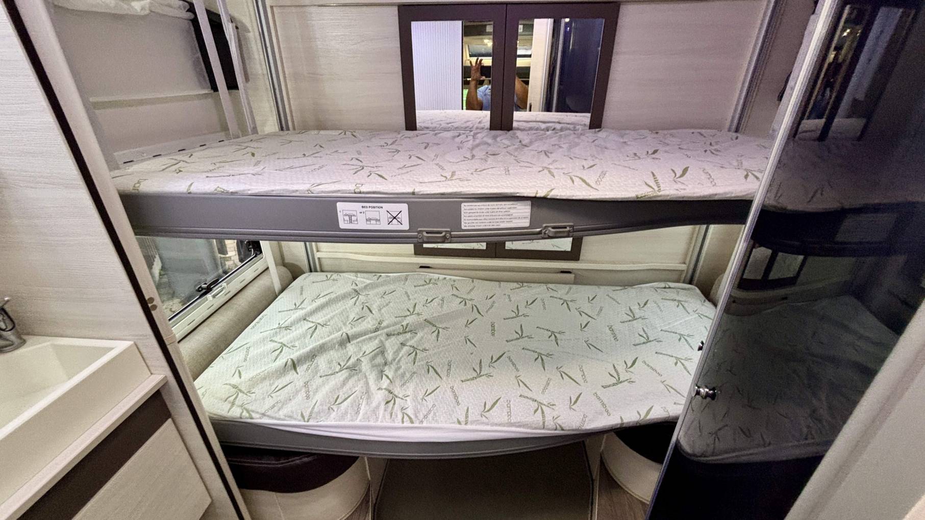 Inside, the layout consists of two spacious lounges (front and rear) providing comfortable seating areas for relaxing, dining, or unwinding in the evenings. Above the front lounge, an electric drop-down double bed lowers at bedtime, keeping the space fully usable during the day. At the very back, there are electric drop-down bunk beds ideal for children or guests, and the front lounge seating can convert into an additional double when needed. In total, the layout provides genuine sleeping for six without feeling crowded.