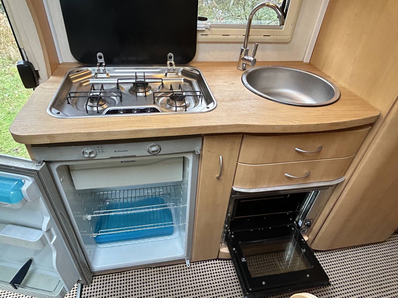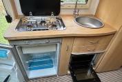 Inside, the layout is designed with both comfort and functionality in mind. Sleeping arrangements include a fixed rear transverse bed and a spacious overcab double bed, easily accommodating up to four people. The large washroom offers a separate shower cubicle, Thetford cassette toilet, wash basin with mixer tap, large mirror, and ample storage for all your toiletries. The well-equipped kitchen features a gas oven and grill, three-burner gas hob, 3-way fridge, and stainless steel sink, allowing you to prepare meals on the go with ease.