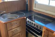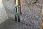 To the left of the kitchen is a comfortable L shaped sofa with the 2 seater forward facing bench seat having 2 seat belts. Across from this is another long bench seat with a small table, perfect for drinks and snacks. There is also a large table for those family meals. This area can be converted into a comfortable double bed. All upholstery has been recovered in a neutral grey. There is plenty of storage in the overhead lockers and some storage below the benches.