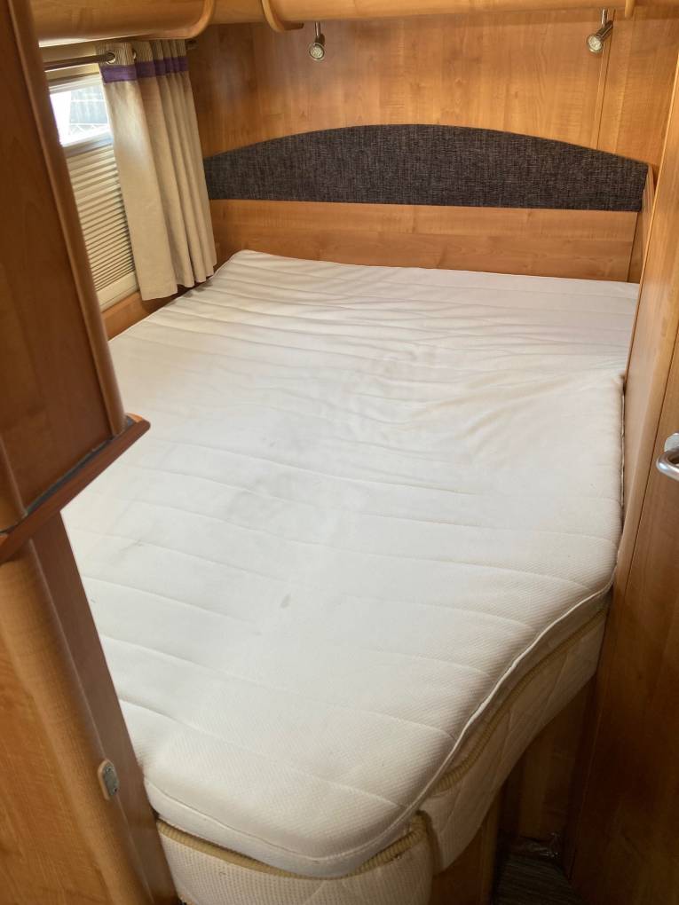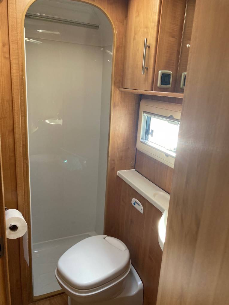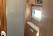 As you move towards the rear of the van there is a large wardrobe, a cupboard with shelving and a large washroom with a shower cubicle, vanity unit with hand basin, mixer tap, mirror and a cassette toilet. At the rear of the motorhome there is a fixed French bed and lots of locker space above.