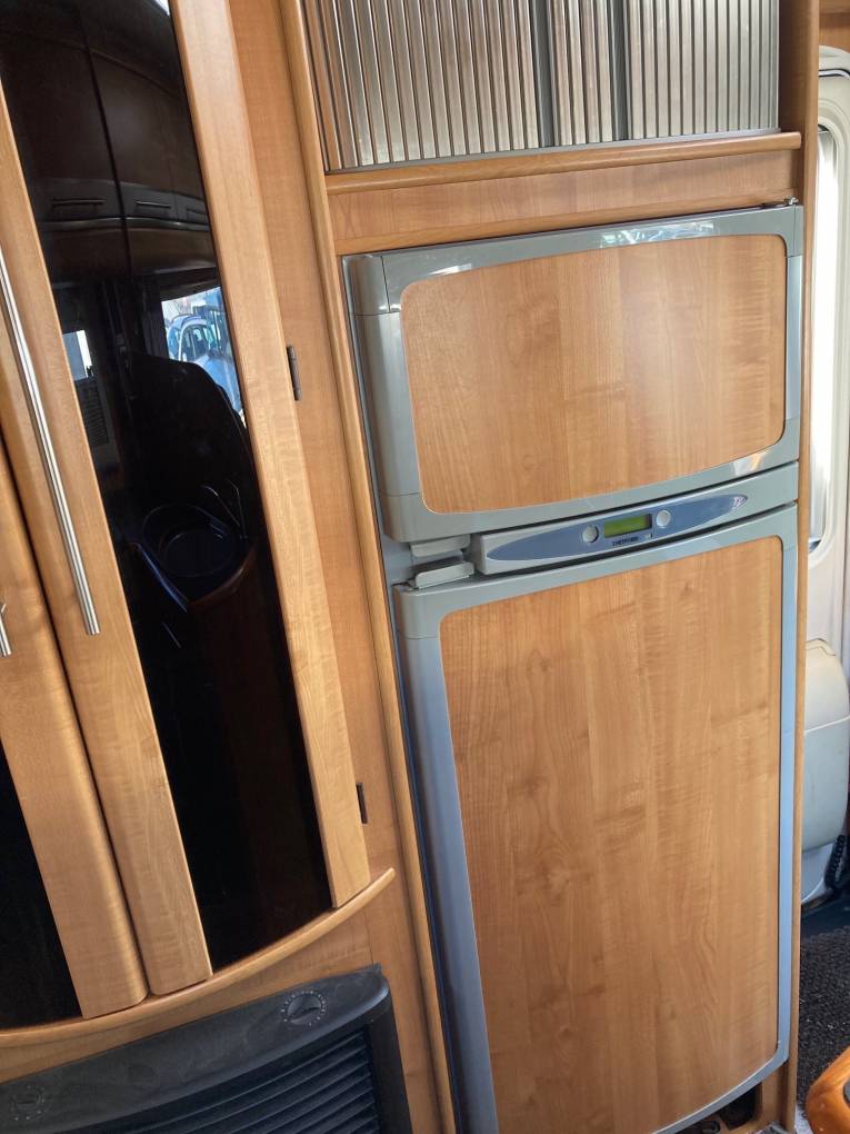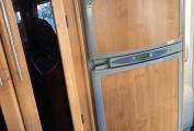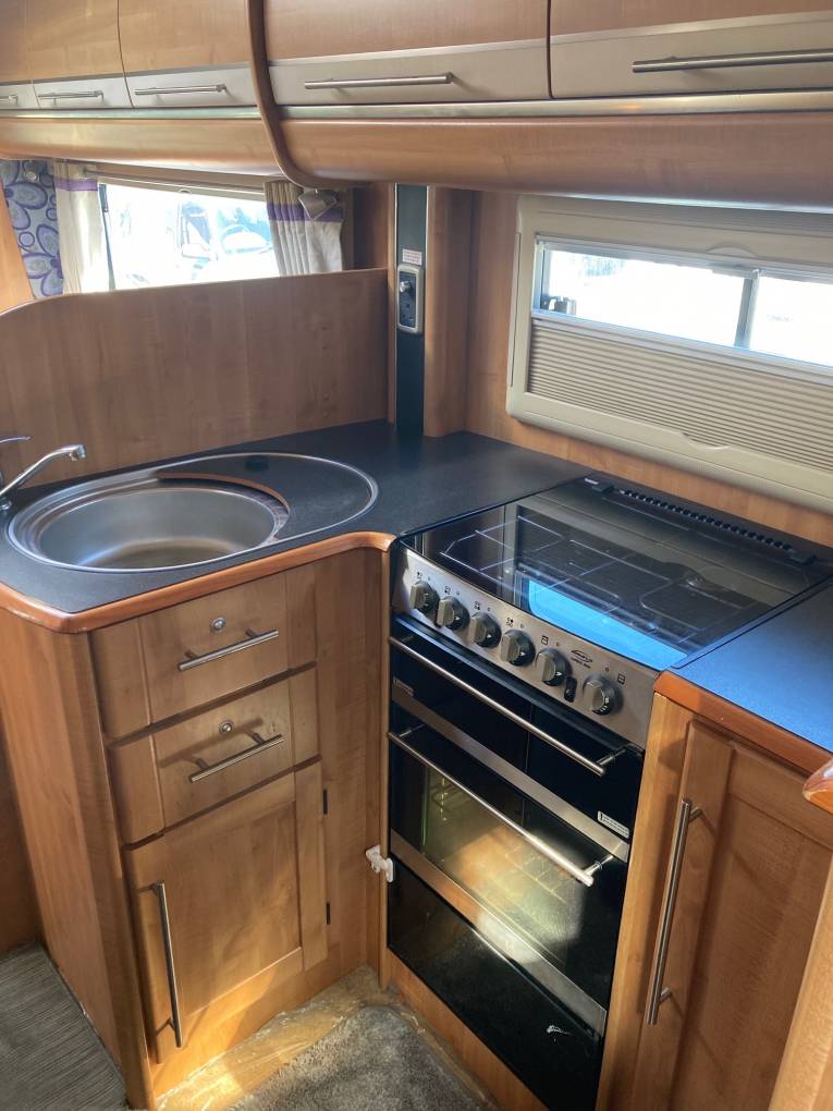 As you enter the van there is a well equipped kitchen comprising of a large fridge with freezer compartment, oven with grill, 4 ring, duel fuel hob, sink with mixer tap and plenty of storage for all you kitchen essentials. The habitation air conditioning unit is above.