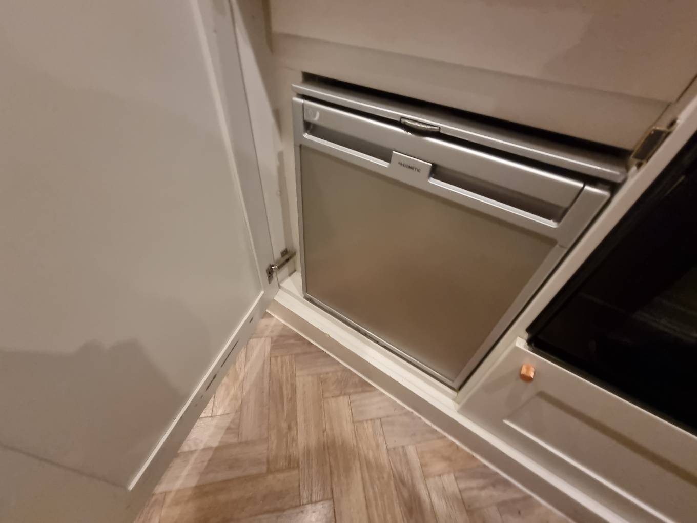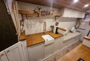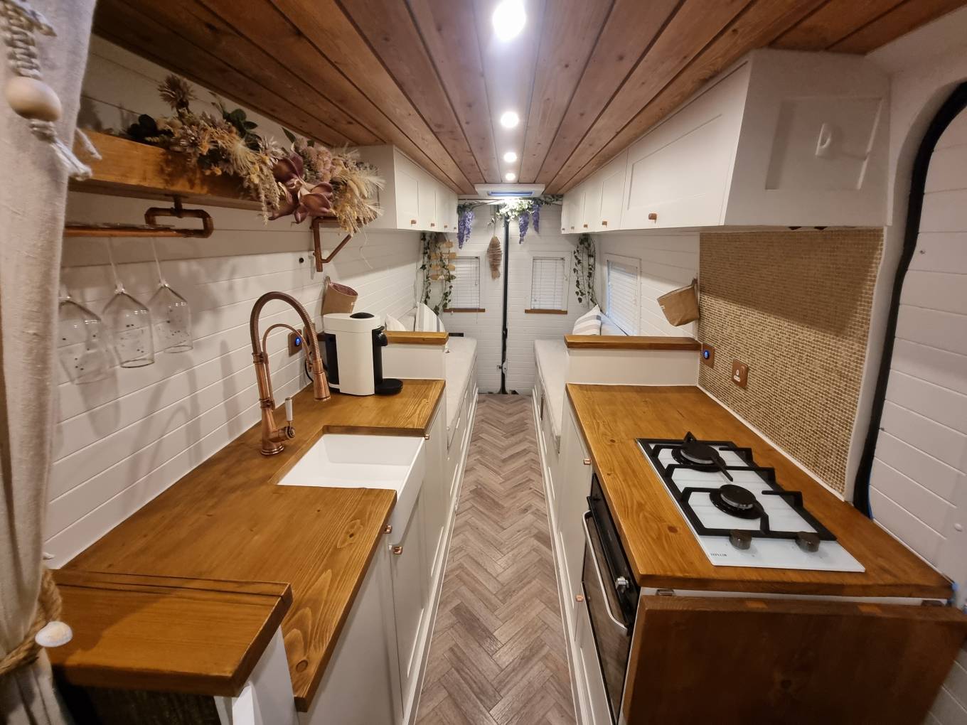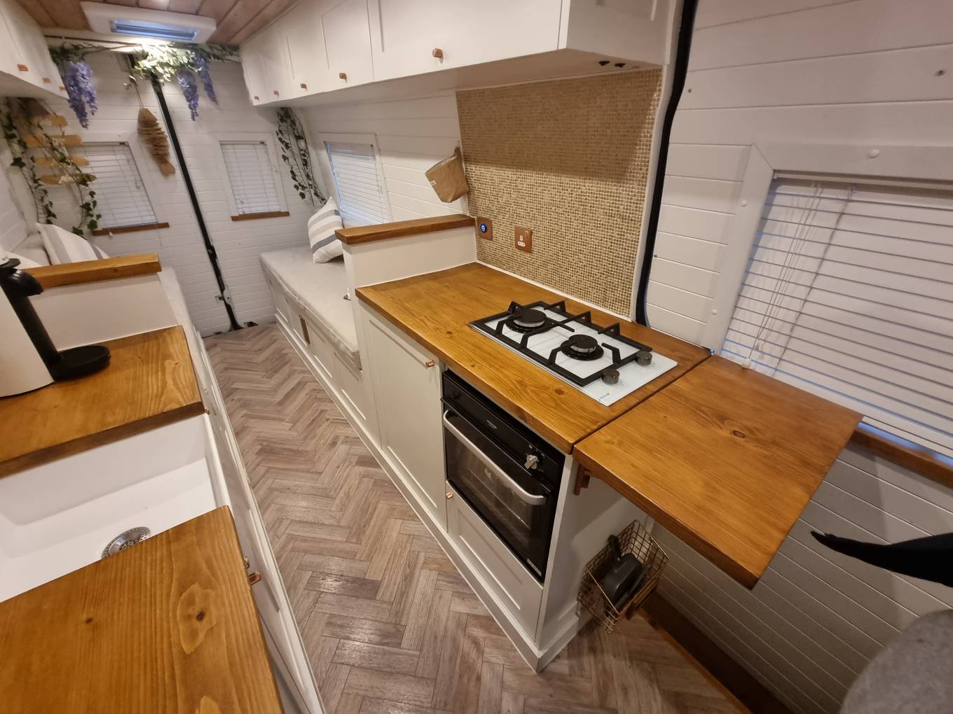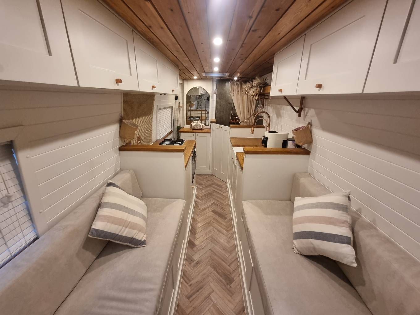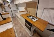 - Mid-section kitchen: generous worktop, sink, hob, fridge, overhead lockers.