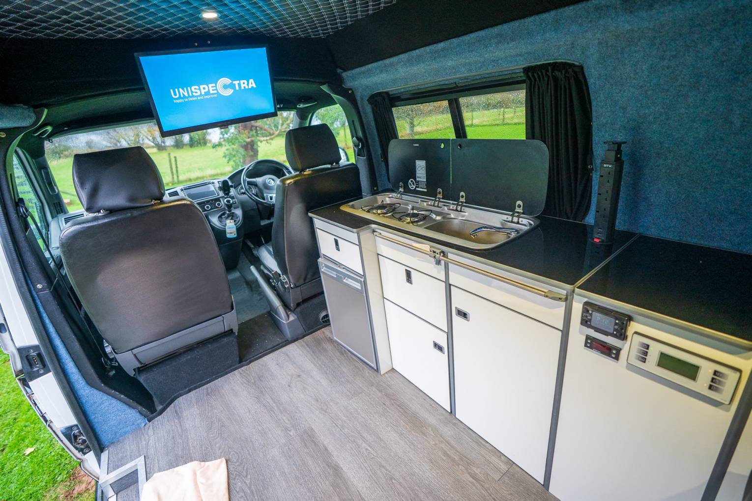 Kitchen & Cooking - Dometic Fridge, Smev hob with 2 Gas Burners, Detachable Centre Dinette, Sink and a large amount of additional storage for your food, supplies, or perhaps your favourite tipple.