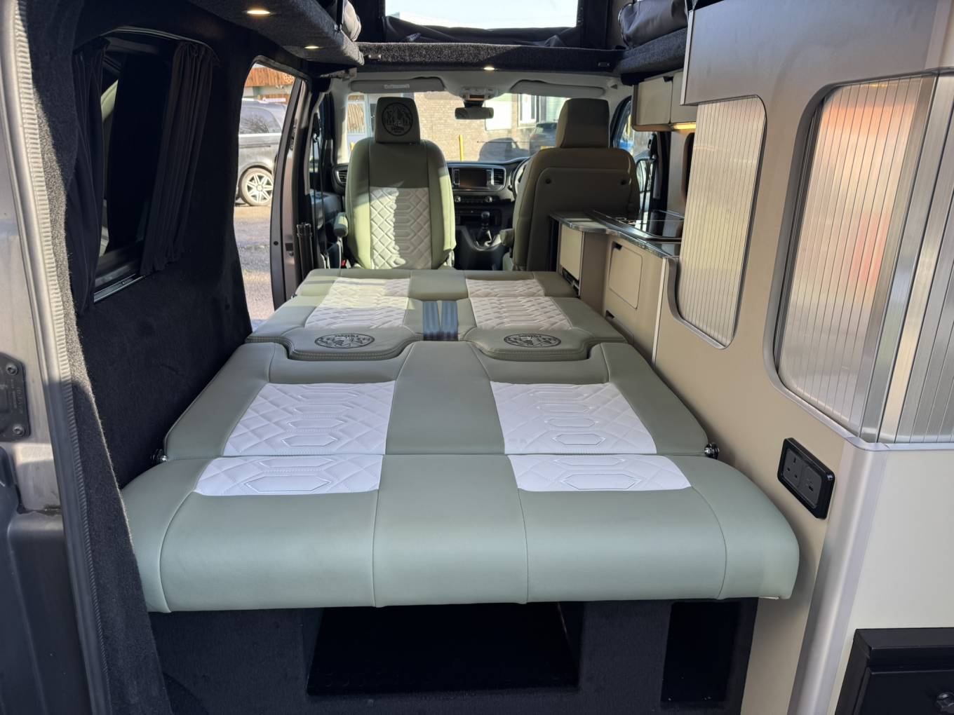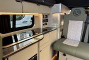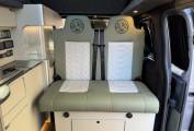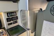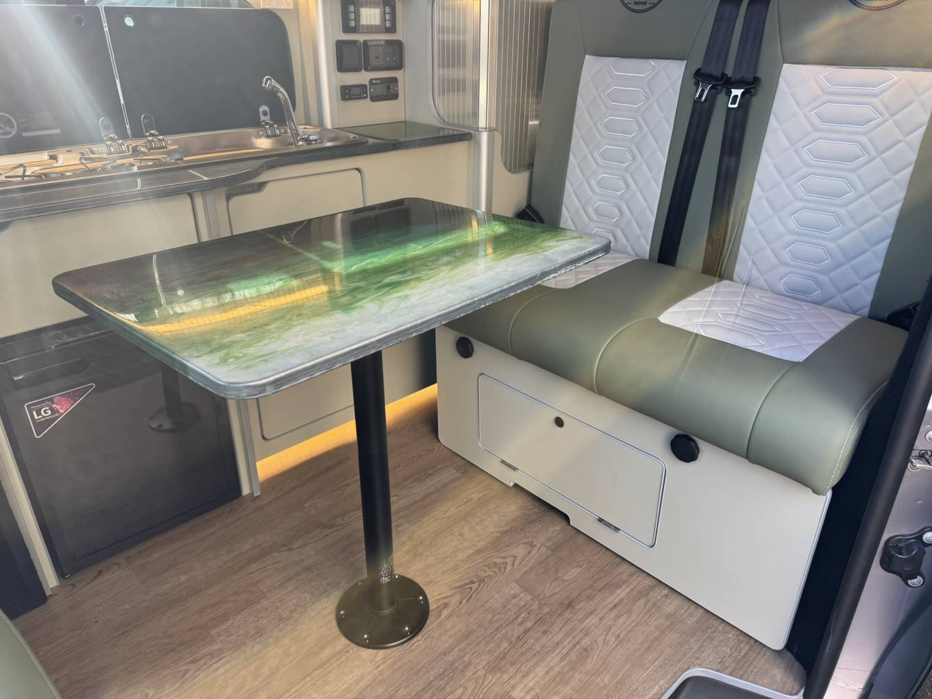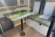 Inside, the living space features a bespoke resin table and matching kitchen worktop, creating a stylish and durable interior. The Dometic twin gas hob and single sink make cooking on the go simple, while the LG 12V compressor fridge/freezer keeps your food fresh wherever you travel. Comfort is enhanced with a RIB bed system, a passenger swivel seat, and an MB Pro diesel heater for cozy nights.