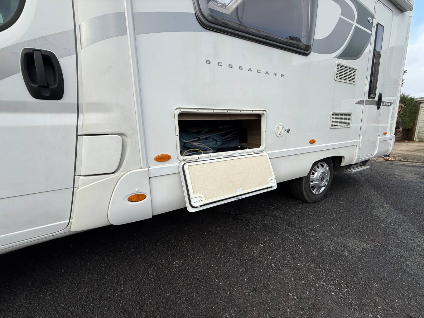 Bessacarr E434, 5 Berth Motorhome with End Kitchen and Over Cab Bed. This motorhome is based on the Fiat Ducato with 2,300 engine, it has been well maintained and is in excellent condition throughout. At the rear is the kitchen, which includes a fitted microwave and next to this is the bathroom. In the center is the lounge area with large bench seat and dinette and at the front there is an over cab bed. it comes with Cab Air Con, Cruise Control, 4 Seat Belts, Rear Camera, TV, Canopy Awning, Bike Rack and Solar Panel. It also comes with 2 sets of keys, gas bottle and mains hook up. Available for viewing by appointment in St Anne's, call for more photos, videos and information.