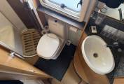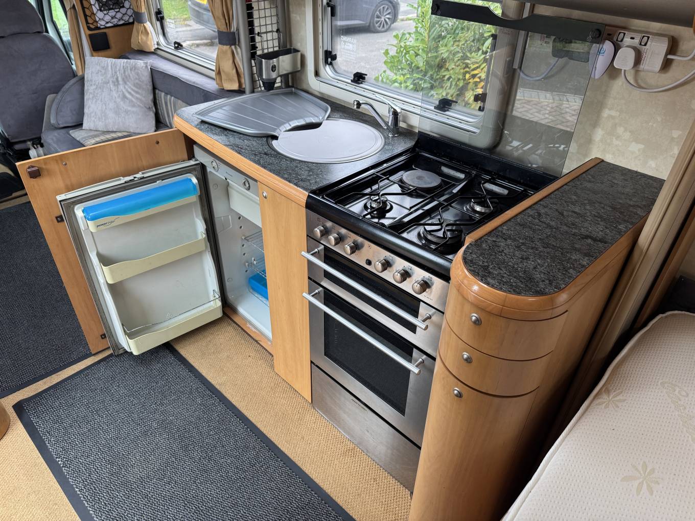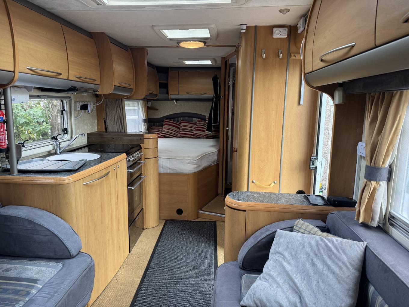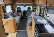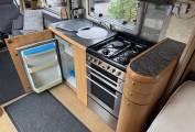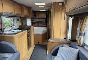 Carrying on through, you come to the kitchen which has everything you need to rustle up a lovely meal. There is a 4 gas ring burner hob, a Thetford oven with grill, a large Dometic 3 way fridge freezer, a sink with mixer tap and lots of storage space for utensils and ingredients plus a good work top area.