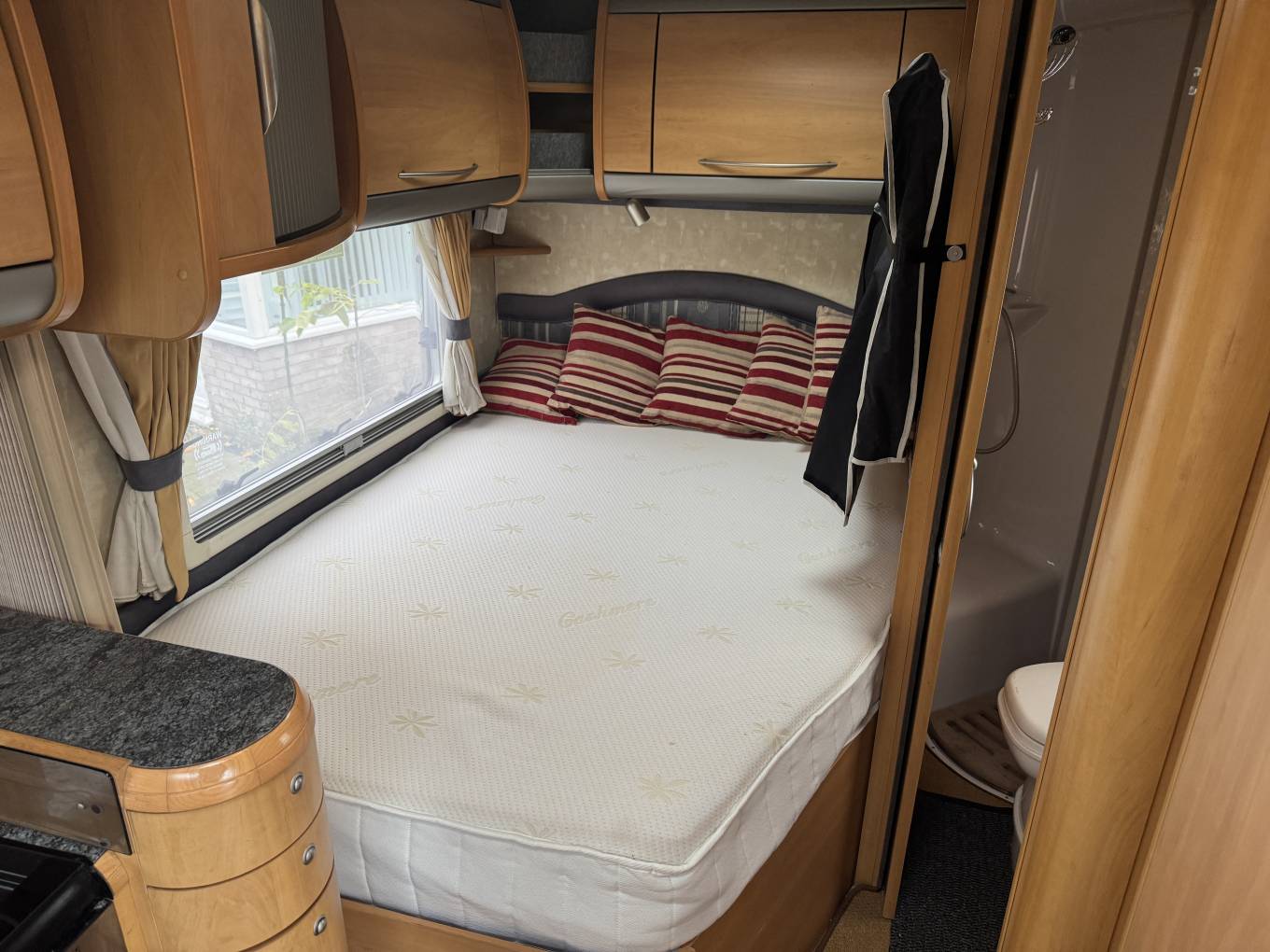 The sleeping arrangements consist of 3 large double beds, the first one is the rear french bed, the second is a huge over cab bed that will easily sleep 2 adults and a dinette that converts in to another good size double bed .
