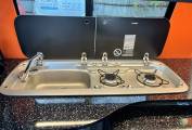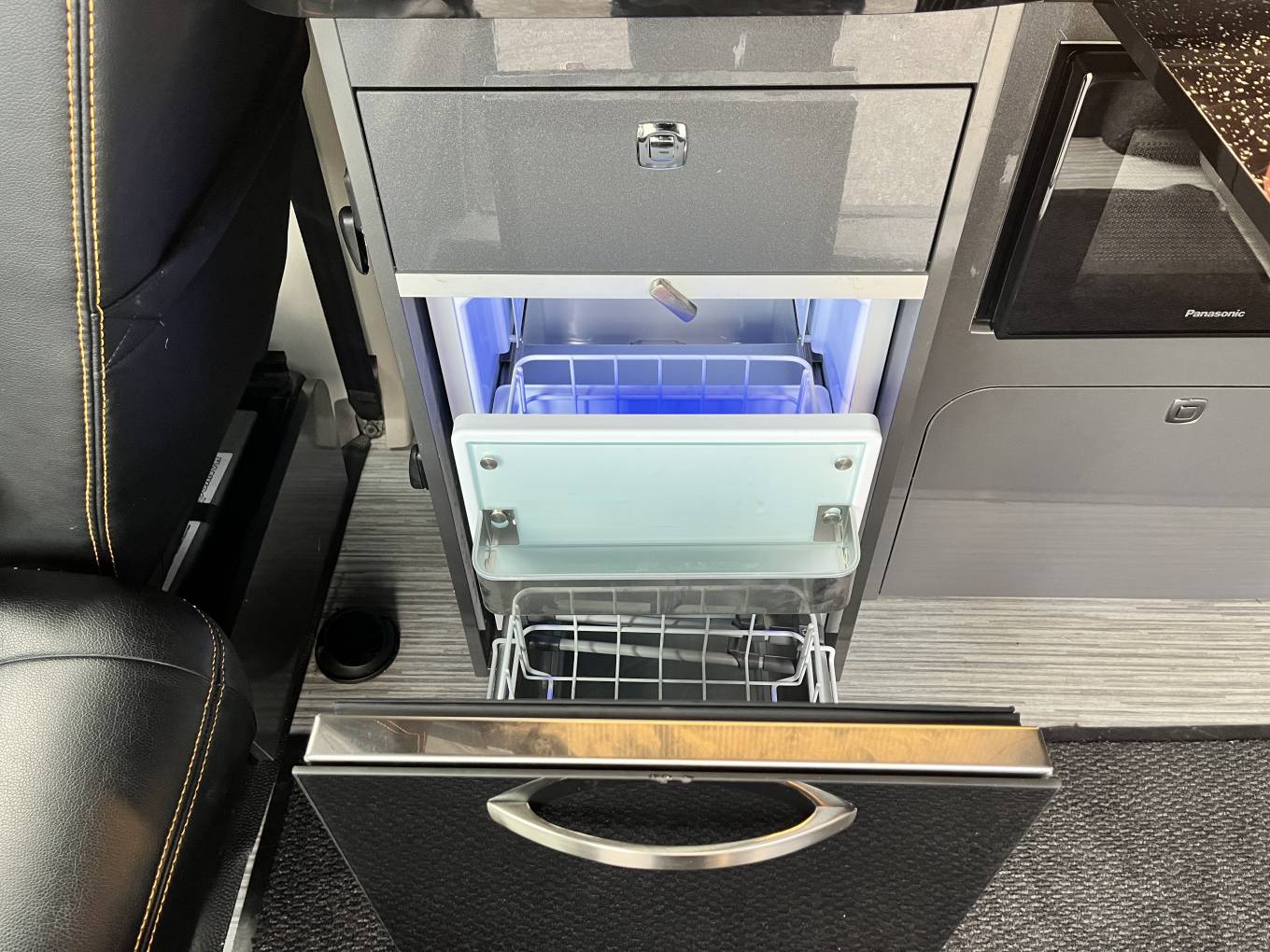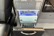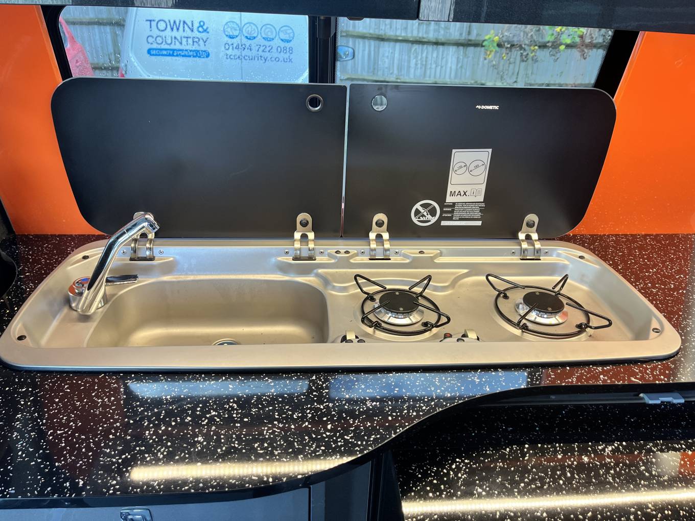 The compact kitchen includes a dual-burner stove, microwave, sink with onboard water supply, and a small fridge, perfect for preparing meals on the road. A Swivelling front seat creates a lounge or dining area, and sliding doors make access effortless, even in tight parking spaces. This model includes a leisure battery and a solar panel for extended off-grid capability.