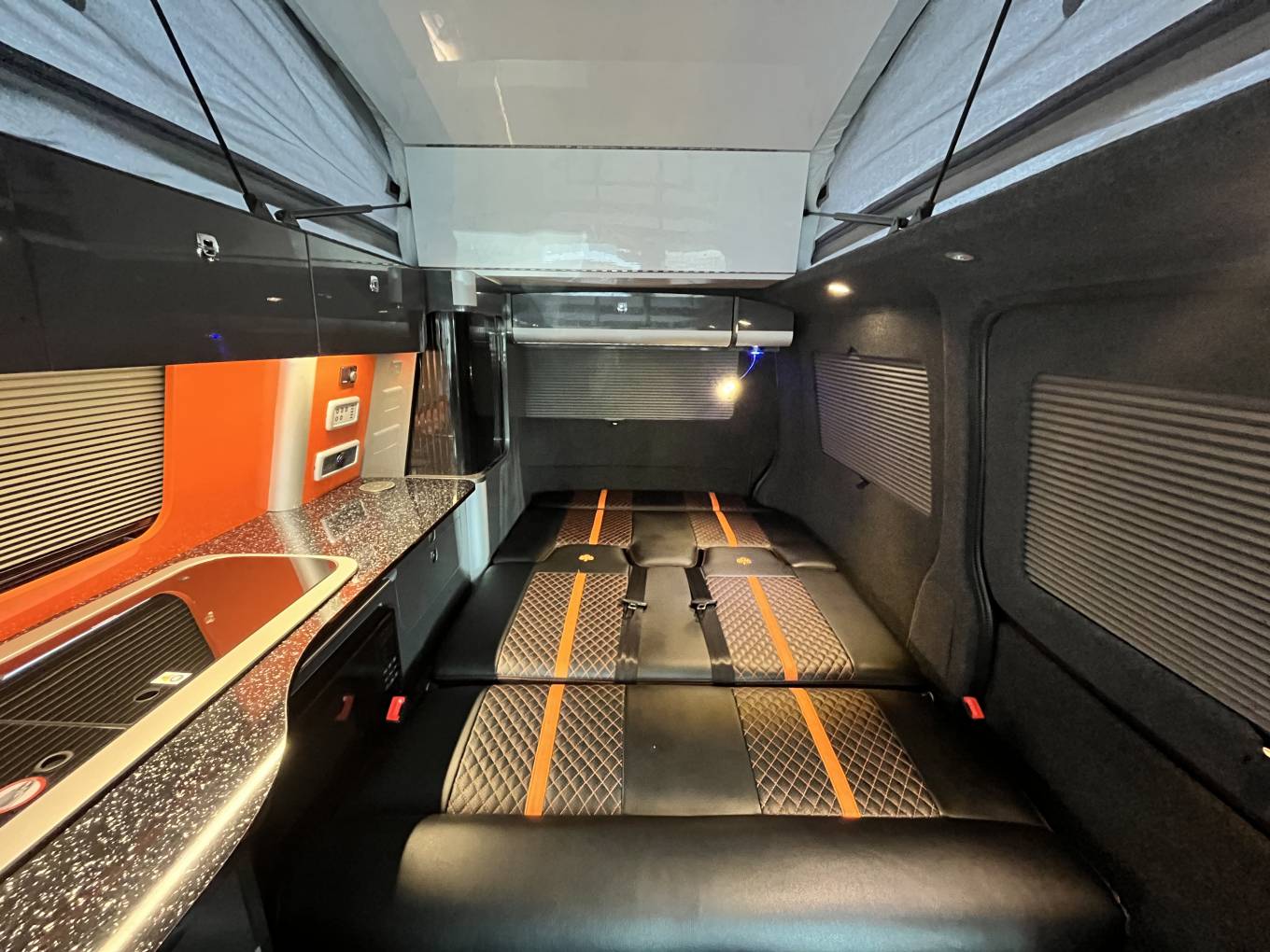 Inside, the layout is cleverly engineered to maximize space. A convertible seating area transforms into a cozy sleeping berth, while pop-top roof expands headroom and adds an extra bed. Insulated panels, efficient Webasto heating, and quality ventilation help keep the interior warm in winter and cool in summer, allowing comfortable travel through changing climates. LED lighting, USB ports, and flexible storage compartments make daily living convenient and organized.