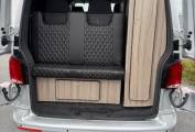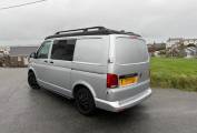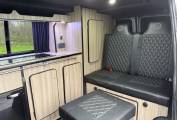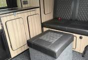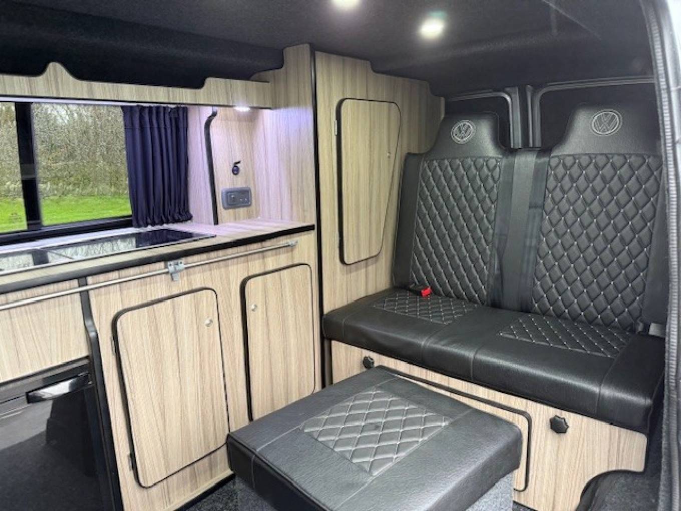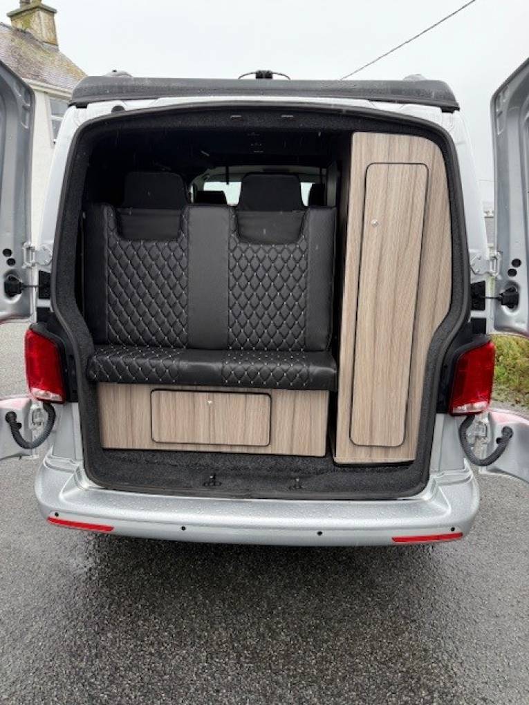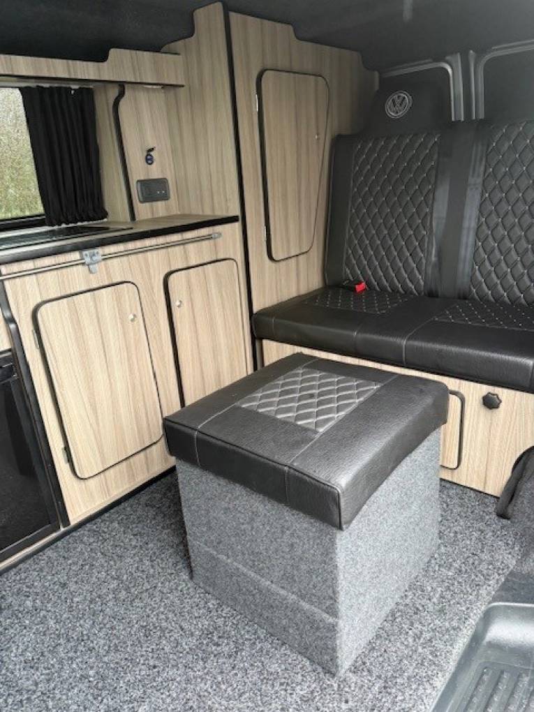 The Conversion has been converted professionally and has a pop up roof with roof rails and intergrated bed, a rock and Roll bed/seat with 2 seat belts, built in furniture with hob/sink fridge and lots of storage, A matching unit that houses a porta potty but also ideal for resting those legs and a a solar panel making it ideal for off gride nights away.