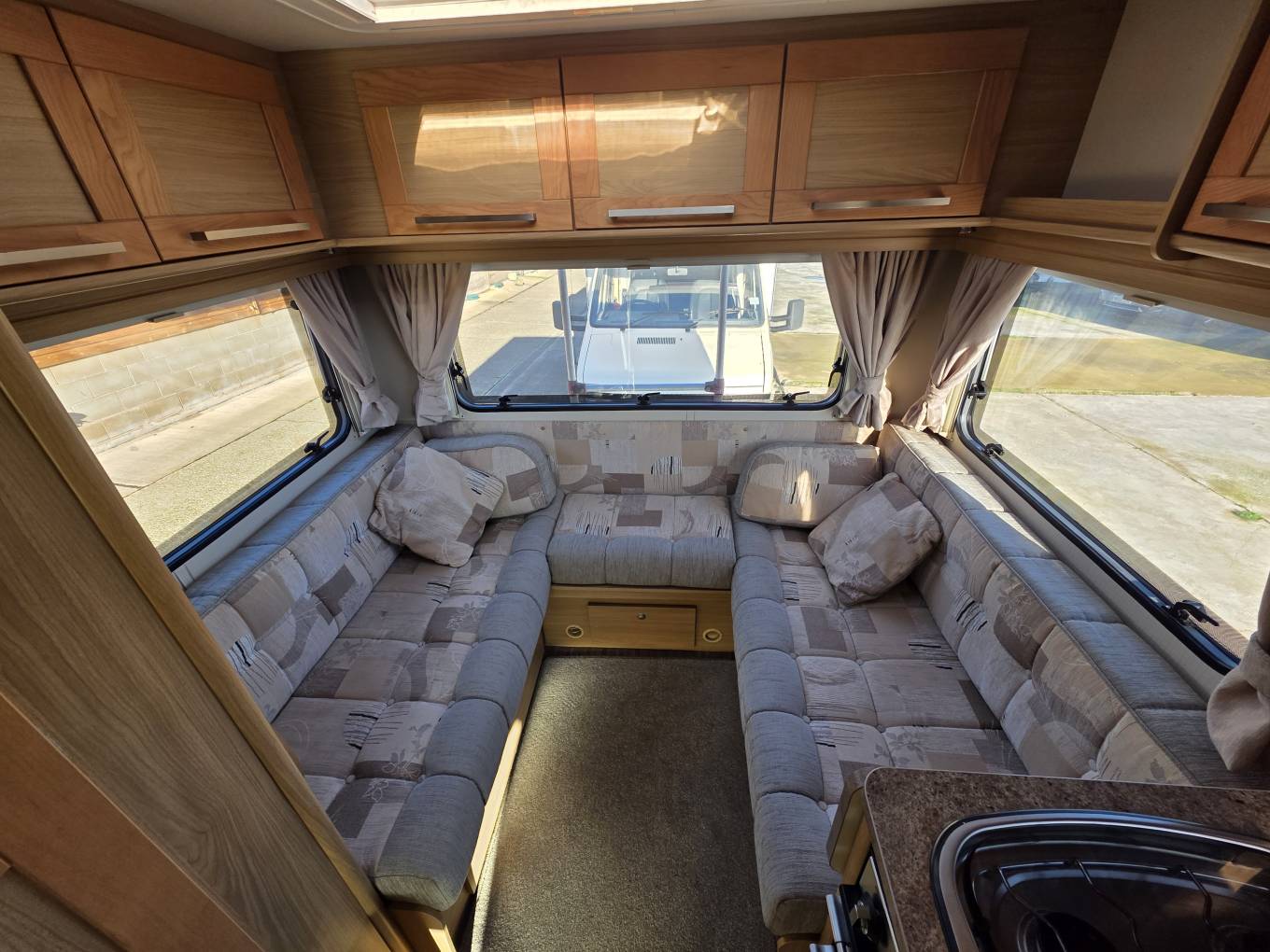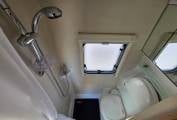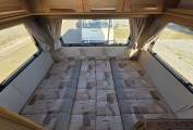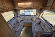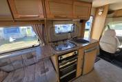The layout is from the rear you have a spacious and social U-shaped rear lounge, a Heki rooflight with large panoramic windows fill the lounge area with light and is perfect for enjoying views all around. At nighttime the bench seats convert easily into a large double bed. The kitchen area has a 3 ring gas hob on top of a combined oven and grill next to which is a sink with a fridge with freezer underneath with a Lift-up worktop flap to extend the preparation area. Opposite is a washroom with shower toilet and wash basin to maximise the space. A wardrobe with hanging rail also stows the freestanding table.