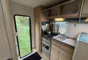 The habitation door is on the rear of the motorhome, and as you enter, the kitchen runs along one side with a gas oven, separate grill and 4 gas hobs, sink with drainer and mixer tap, storage and a 3 way fridge. On the opposite side is the washroom with a cassette toilet, wash hand basin and shower.